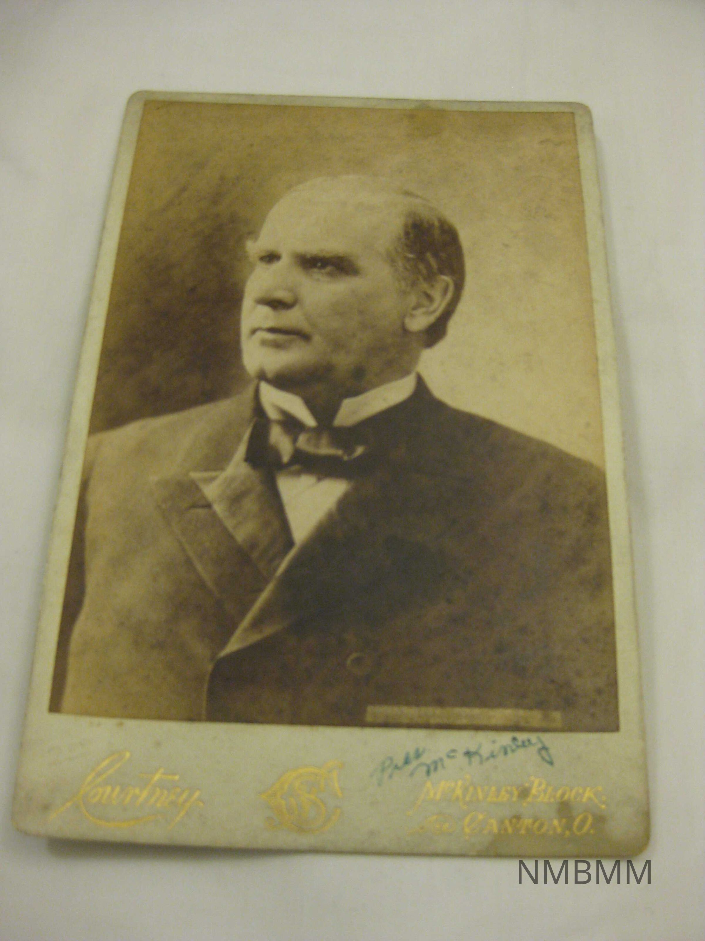This item is a black and white photograph of William McKinley taken in April of 1896 before he is president. It was taken by Courtney in Canton. McKinley is seen wearing a suit with dress shirt and bow tie. The copyright information is displayed on the lower right hand corner of the image. Photographer information is displayed in gold lettering on front of the image. Someone wrote "Pres. McKinley" on the front of the image in green ink. The back of the image also features the photographer's information.Collection
