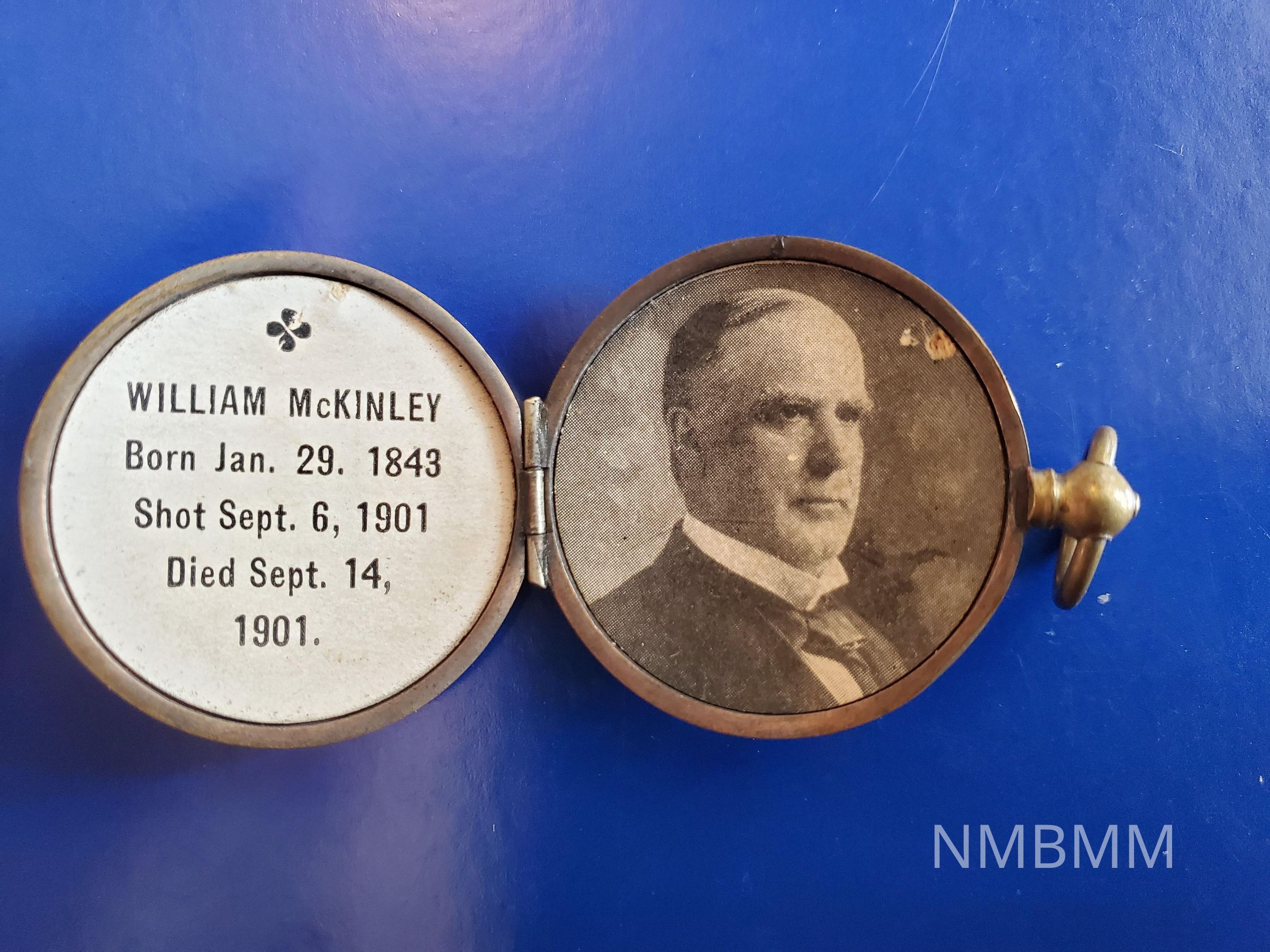 A gold President McKinley locket. The inside left says "Born Jan. 29. 1843, Shot Sept. 6, 1901, Died Sept. 14. 1901. The inside right features a black and white McKinley portrait. Outside features a floral design. There is a ring at the top for wearing.