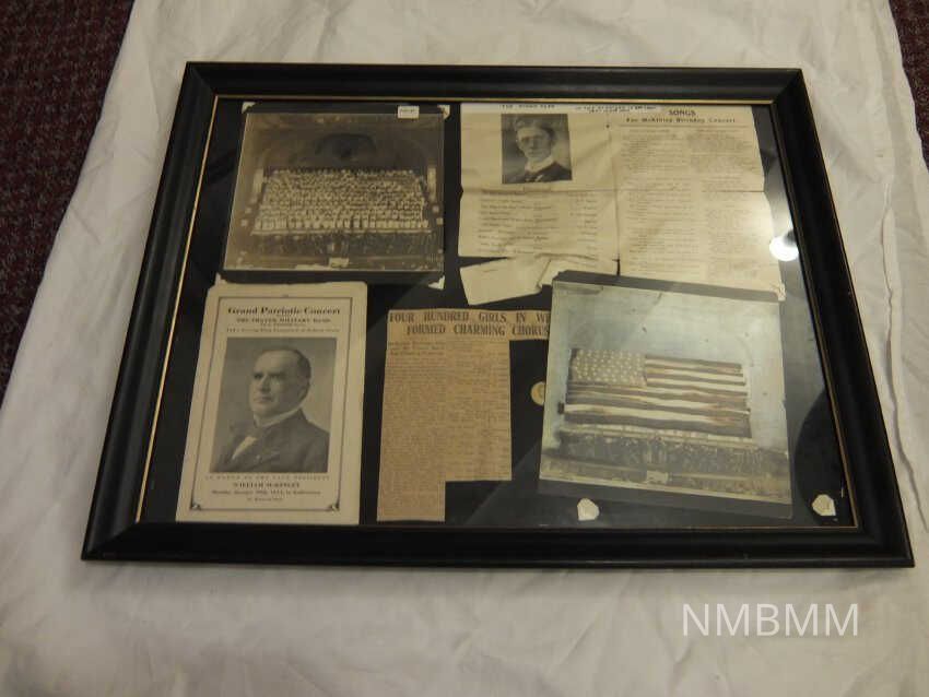 This item is a framed display containing artifacts from the "Grand Patriotic Concert" given by the Thayer Military Band in honor of President McKinley. There are two programs from the event- one is closed and the other one is opened, revealing the lyrics to the songs for McKinley's birthday concert. Also, is a newspaper clipping discussing the 400 girl chorus that sang for the event. Furthermore, there are two pictures of the all girl chorus.