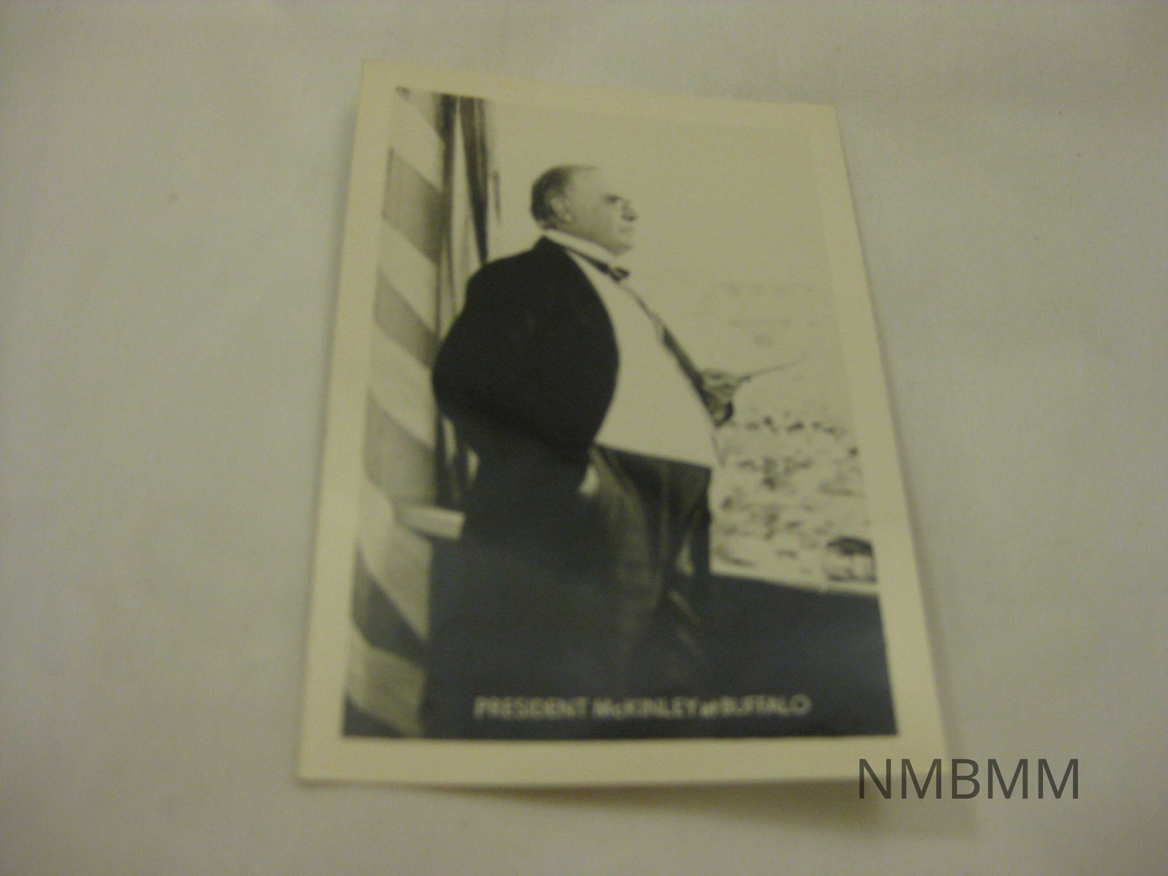 This item is a black and white image of President McKinley giving his last speech in Buffalo, New York before he was assassinated. He is standing in front of a flag draped background and is holding his speech in one hand. He is dressed in pin stiped trousers, a white vest, a bow tie, and a long coat which also appears to be pin striped and is wearing glasses. He is facing the crowd.Collection