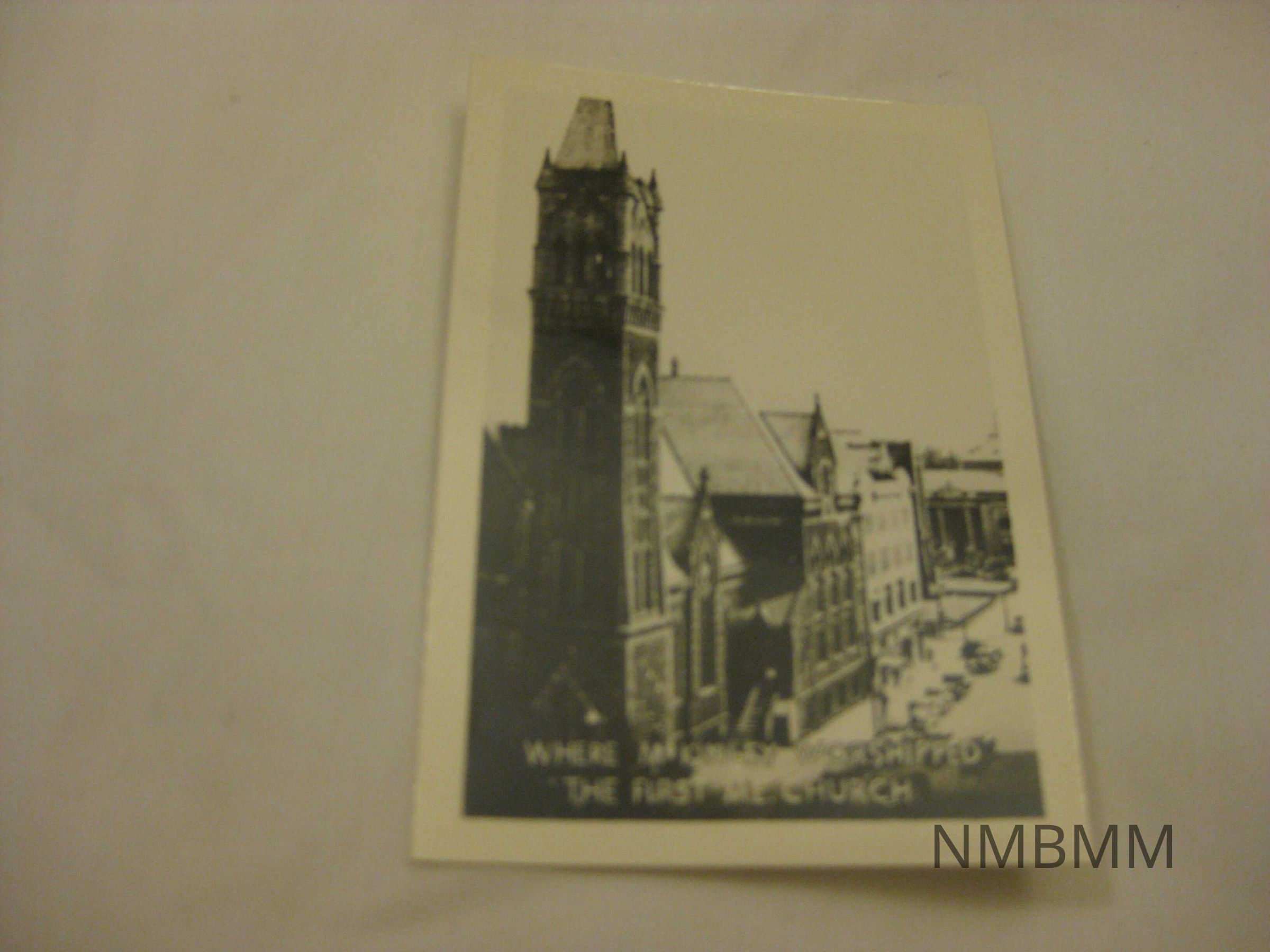 This item is a black and white image of President McKinley's church, The First Methodist Church in Canton, Ohio. The image shows the church, cars parked next to the church, and people walking the sidewalk.