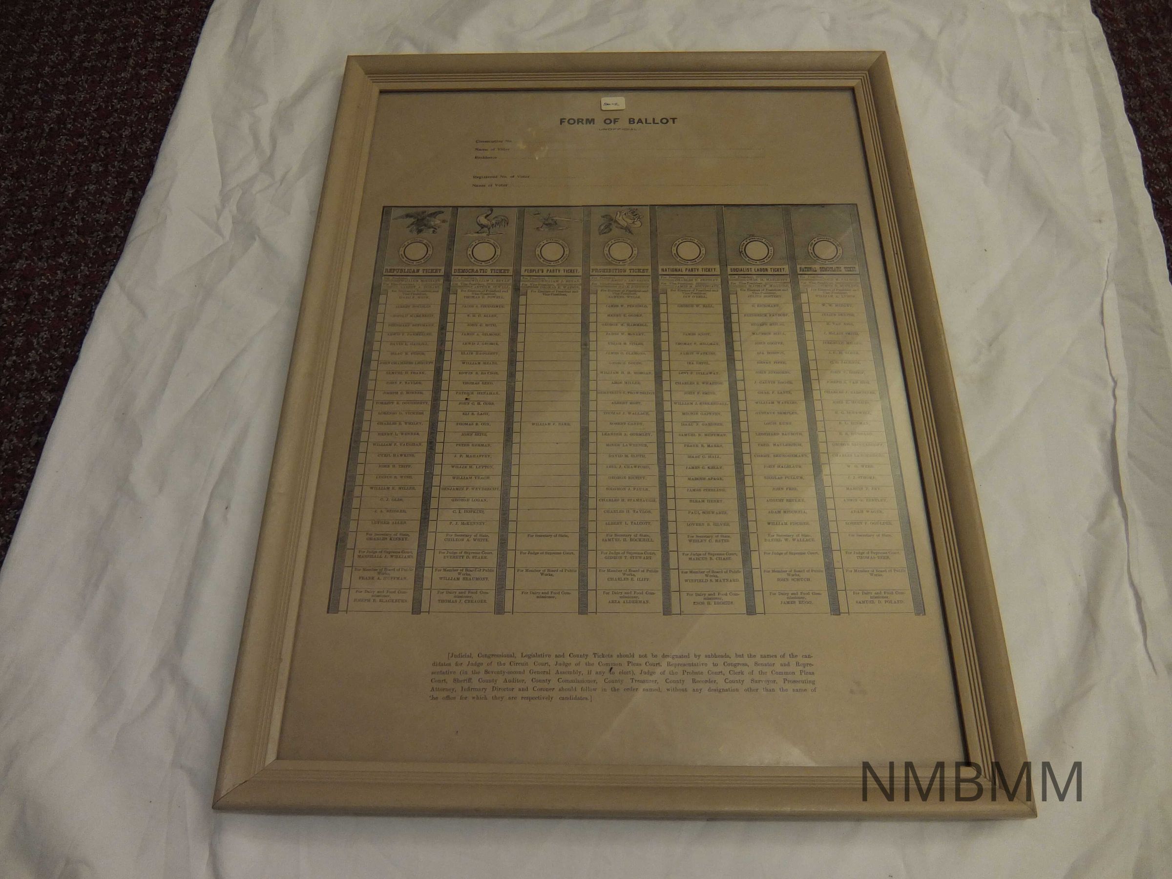 This item is a framed display of the 1896 Presidential Ballot. The ballots are not orginals, but rather, they are copies. The back of the frame is a written explanation of the ballots, how to vote, and marking the ballot.Collection