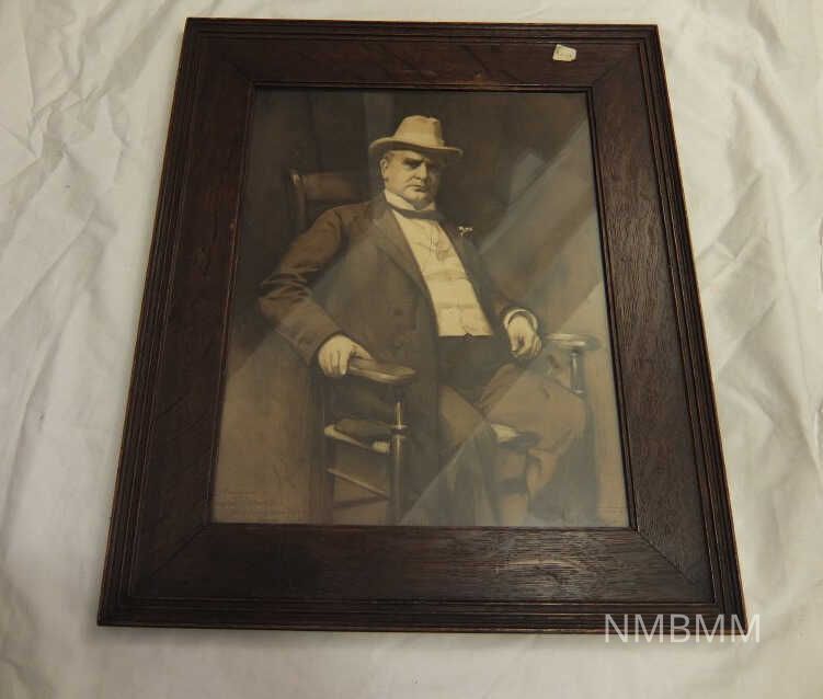 This item is a framed painting of President McKinley sitting down. He is wearing a suit and a hat. The back of the frame reads, "From Snook & Kilmer, ground, floor, studio, and art rooms. 138 S. Howard St., Akron, Ohio. Etchings, Engravings, Water Colors, Pastels, and a full line of Artists' MAterials are always kept in stock. Picture Frames to Order."