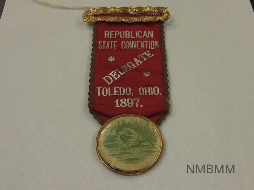 This item is a red ribbon for the Republican State Convention, Toledo, Ohio, 1897. Whitehead & Hoag, Newark, New Jersey.Collection