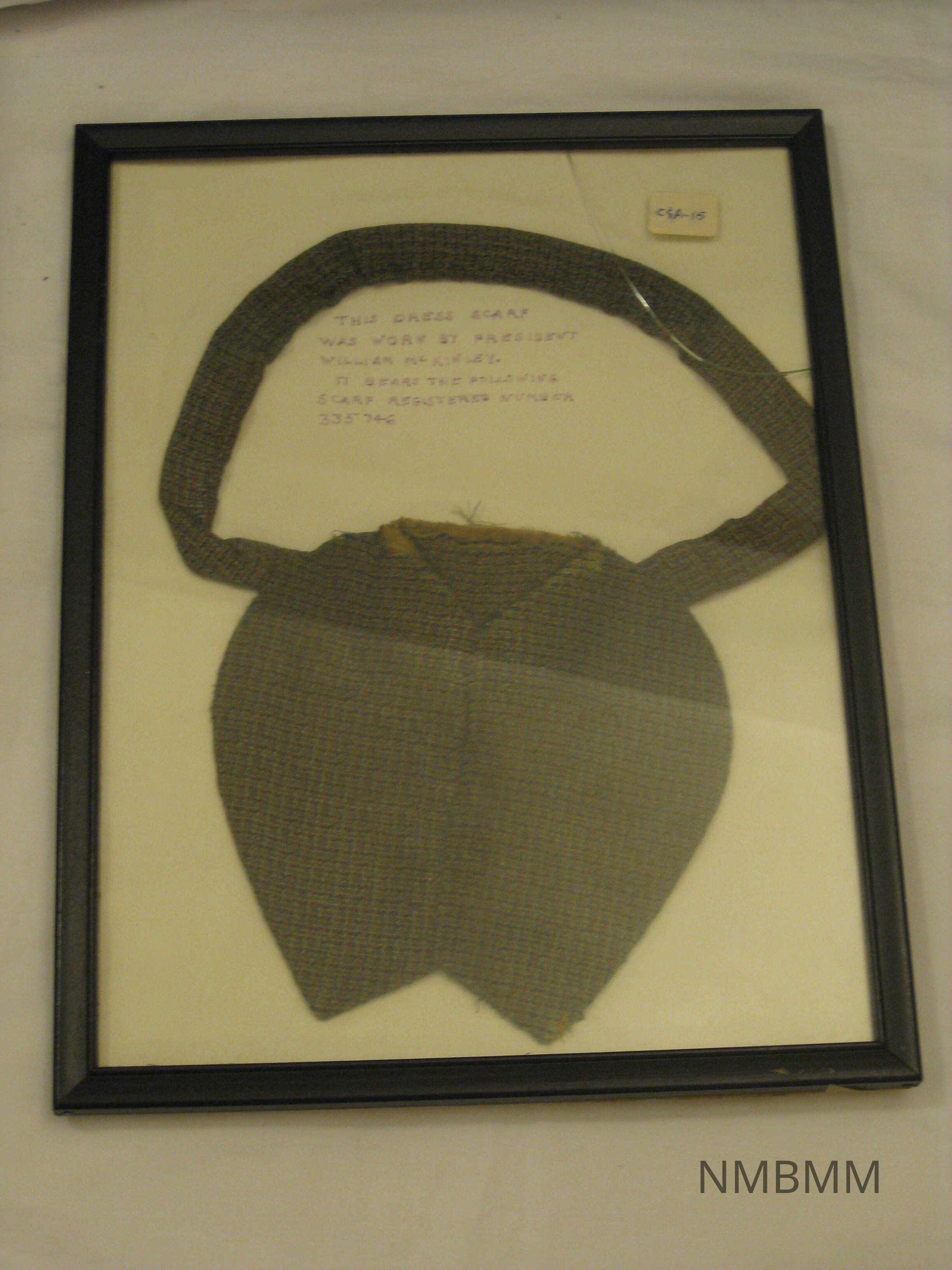 This item is a dress scarf worn by President McKinley. It has a "scarf registration number" of 335746. The scarf has navy, green, olive, and red stitching.Collection