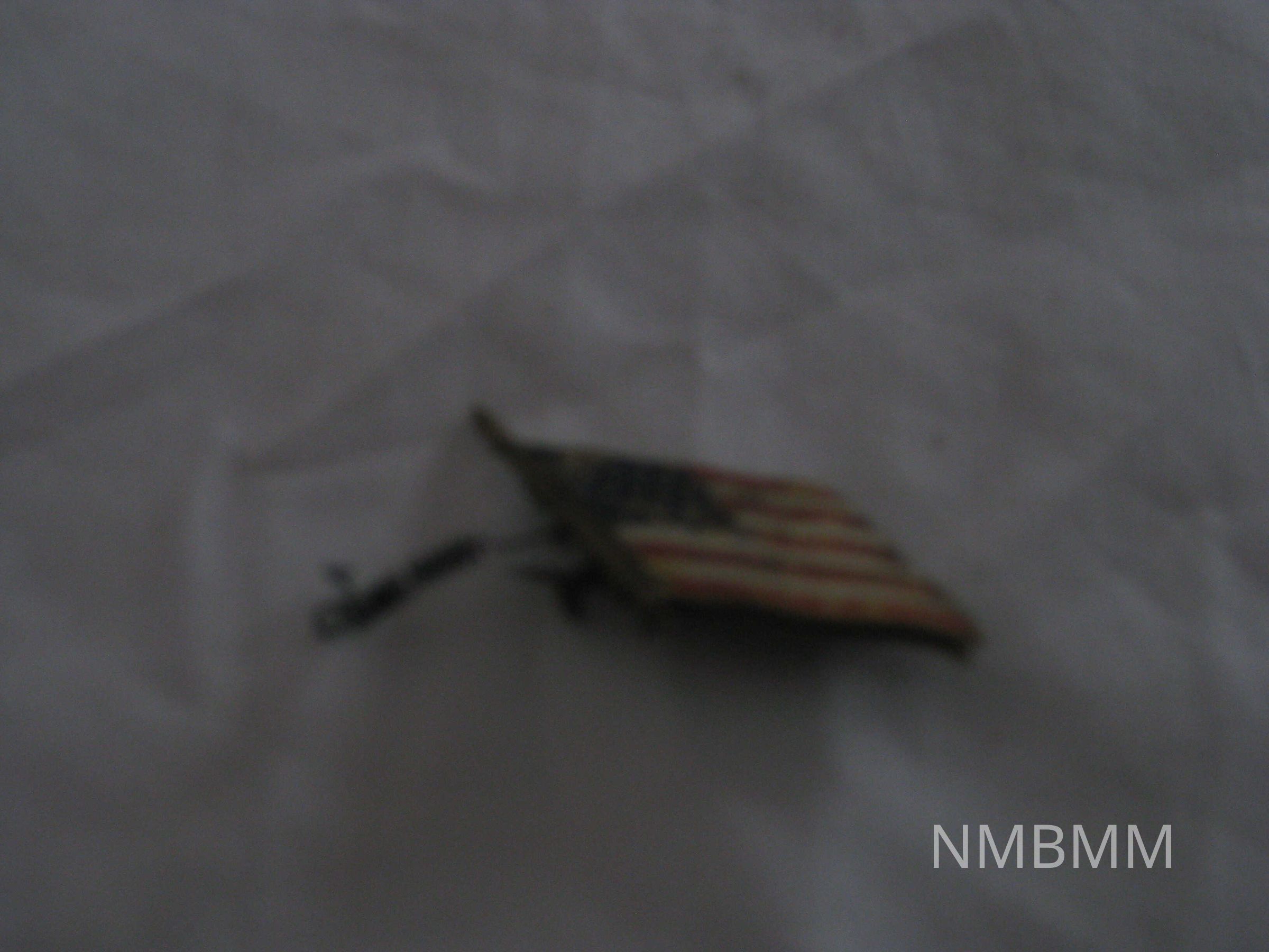The item is a gold, red, white, and blue American flag pin with a broken spring. Decorative flowers on back of pin. Letters P.A.T visible. Rest of letters not legible.