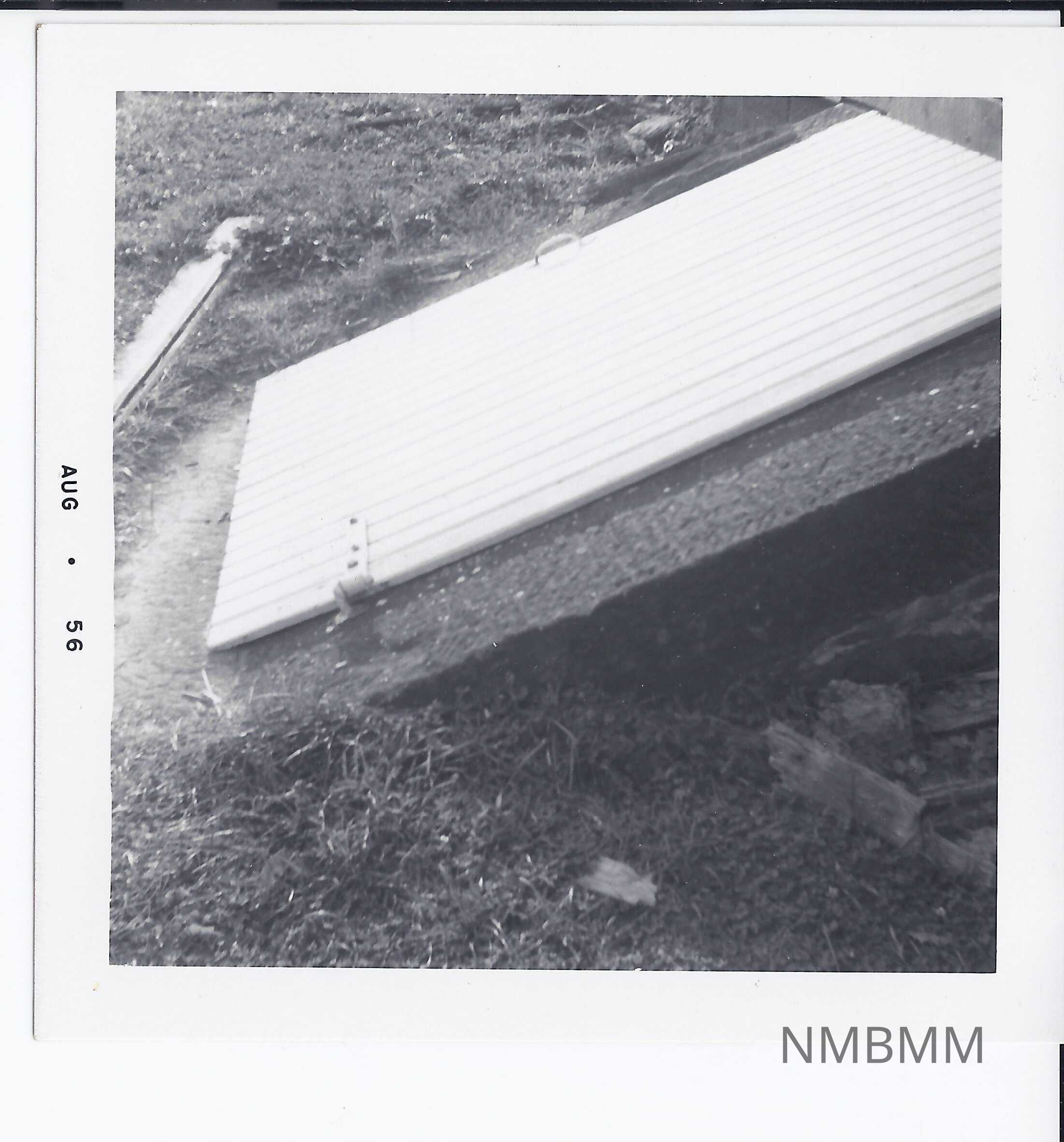 This is a picture of the outside cellar door on the south side of the McKinley farmhouse. The text on the back of the picture reads "Similar to picture #8. August 26, 1956.