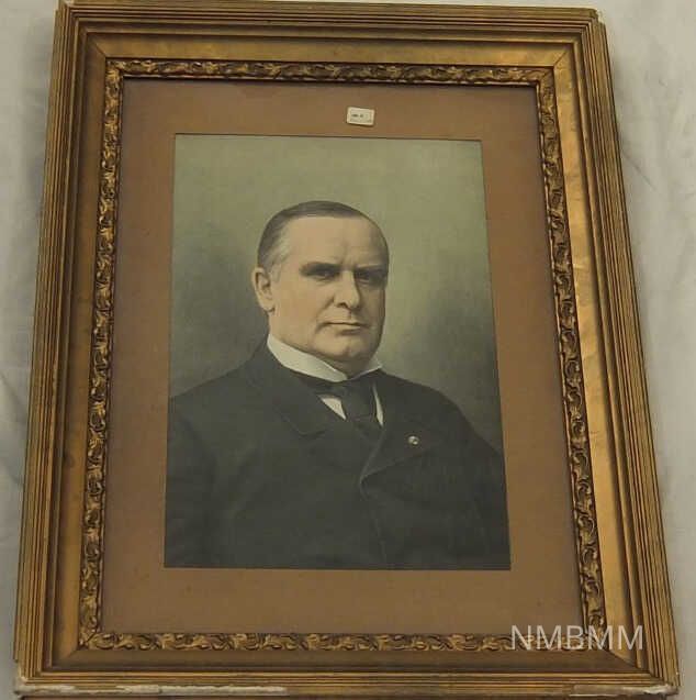 The item is a framed color portrait of President William McKinley with brown matting and a decorative gold frame. Frame and back are made of wood.Collection