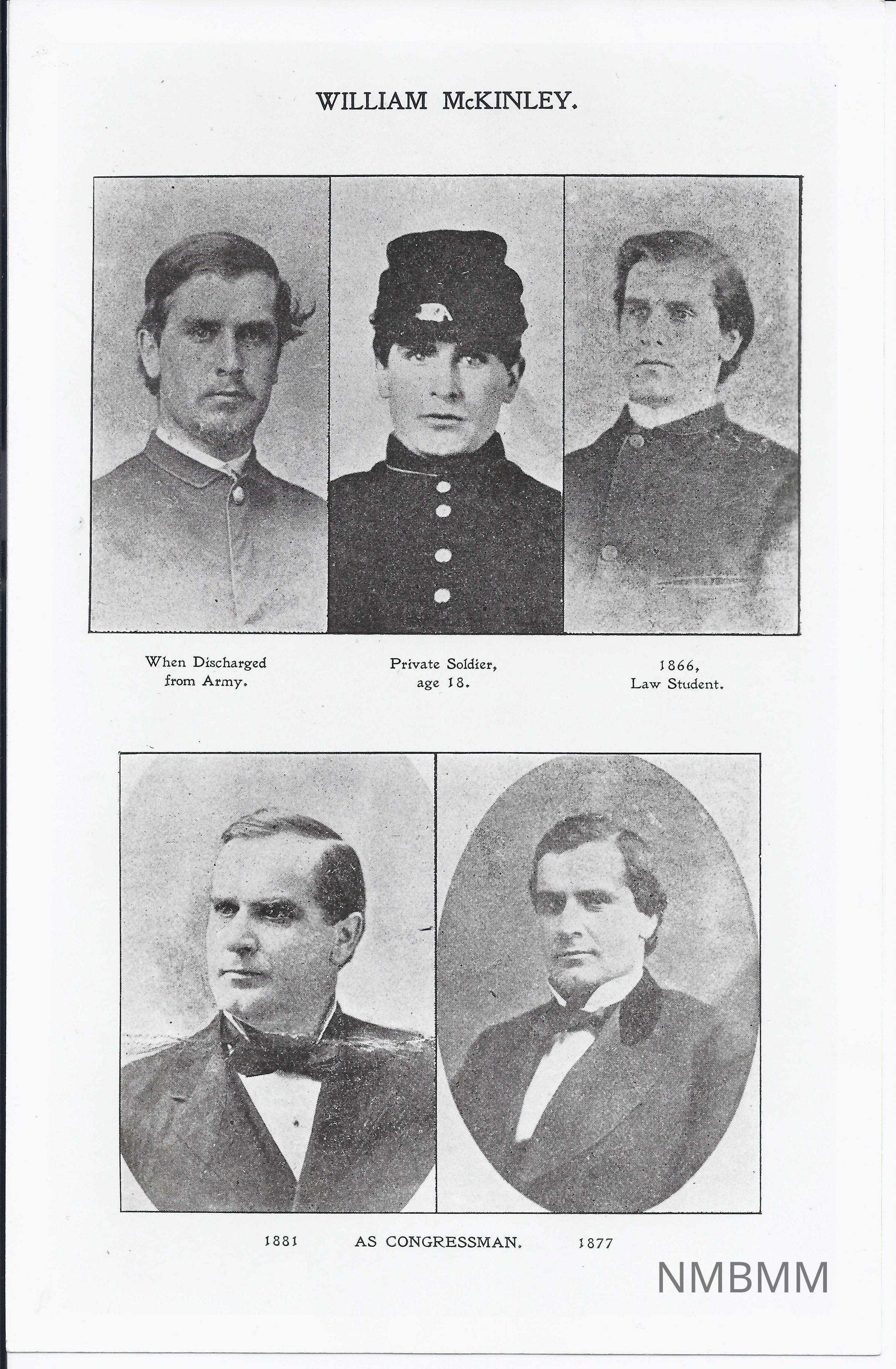 This is a black and white picture that shows copies of images of McKinley through his life from the age of 18 when he was a private soldier to his life as a Congressman in 1881.
