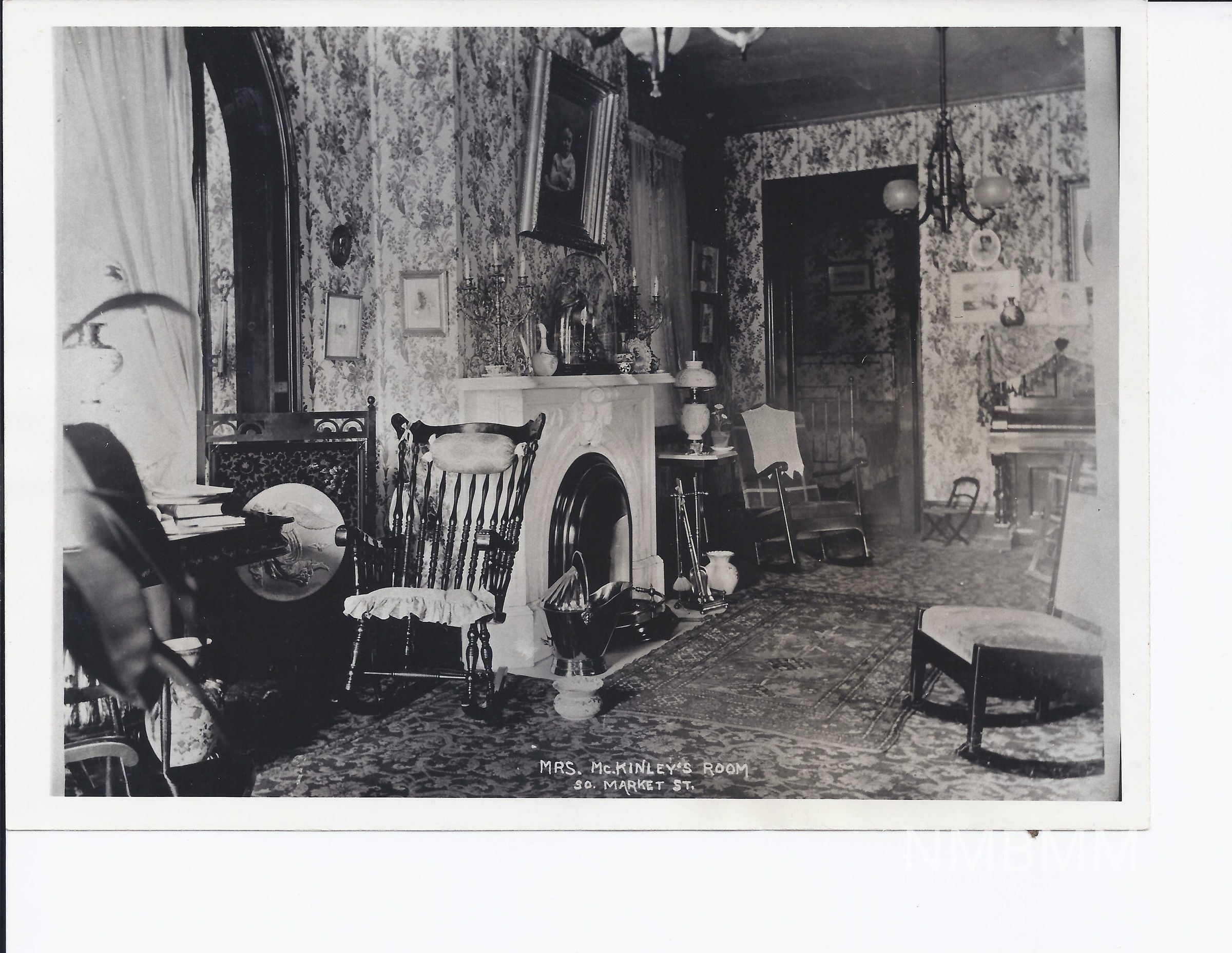This is a black and white picture that shows Ida McKinley's room on Market Street in Canton, Ohio. The text on the back reads Carl L. Haddox - Photography. 1301 Hoover Place N. W. Canton 3, Ohio." A larger version of this picture is available with 2010.1.486.Collection