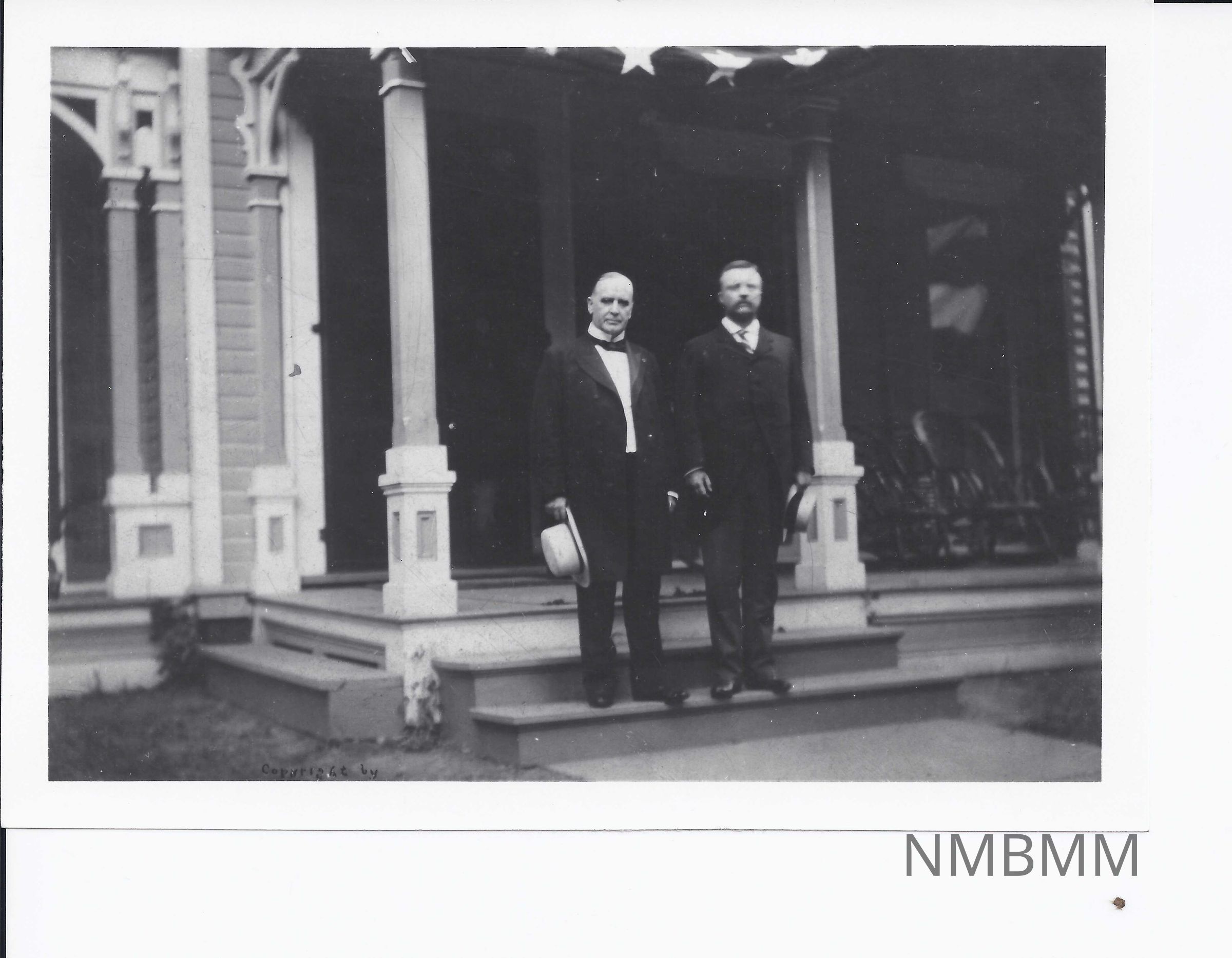 This is a black and white picture that shows William McKinley standing beside Theodore Roosevelt on McKinley's porch in Canton, Ohio. The print measures 6 1/2" by 4 5/8".Collection