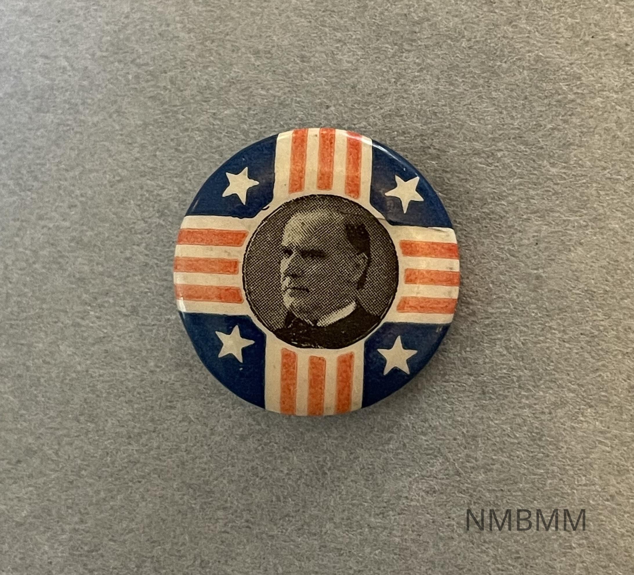 Pin containing a portrait of President McKinley. The portrait, facing left, is surrounded by four white stars, a red and white striped cross, and a blue colored background.Collection