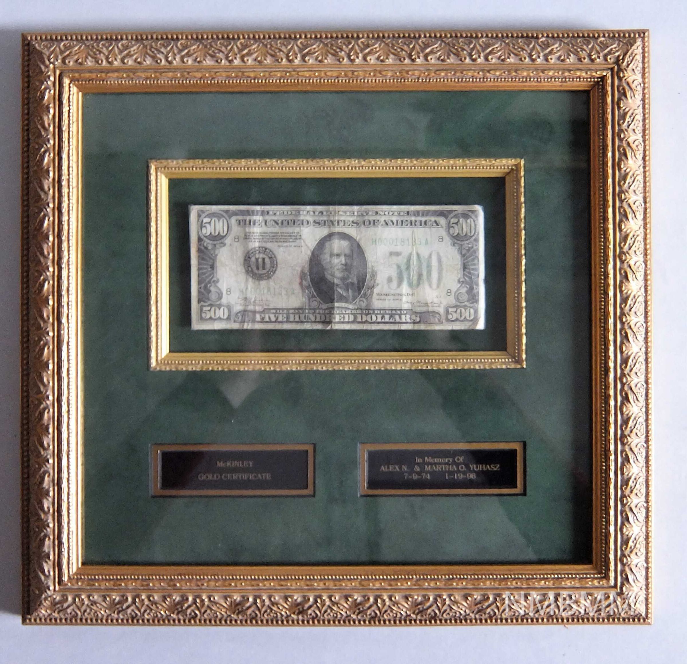 Framed $500 McKinley Bill. the bill is on top, with two plaques at the bottom, entitled "McKinley Gold Certificate" and "In Memory of Alex M. (7-9-74) and Martha O. Yuhasz (1-19-96)"