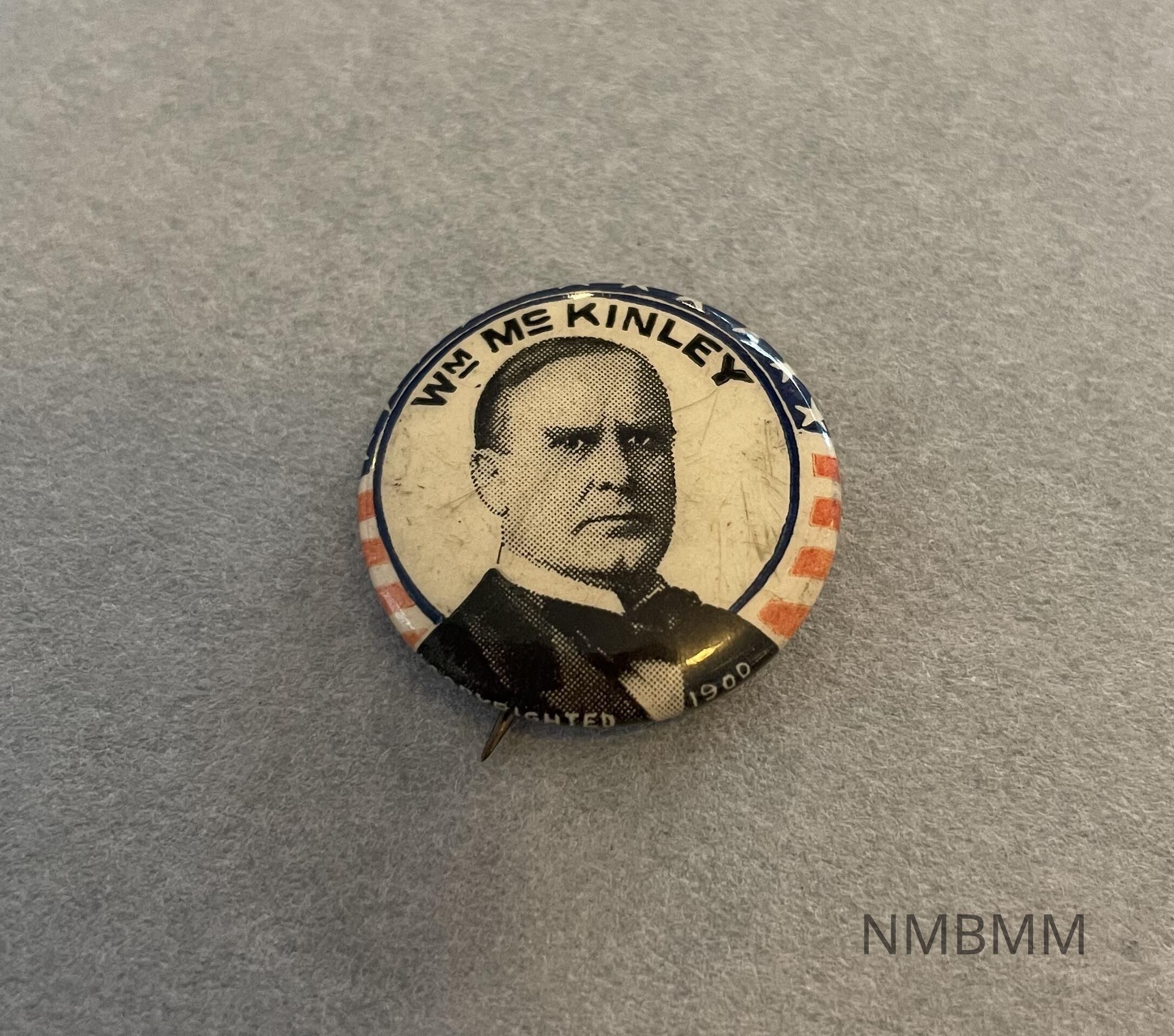 This item is a pin with a portrait of President McKinley. The caption on the front reads "Wm. McKinley", and there is a white circle behind the portrait with an American flag in the background.Collection