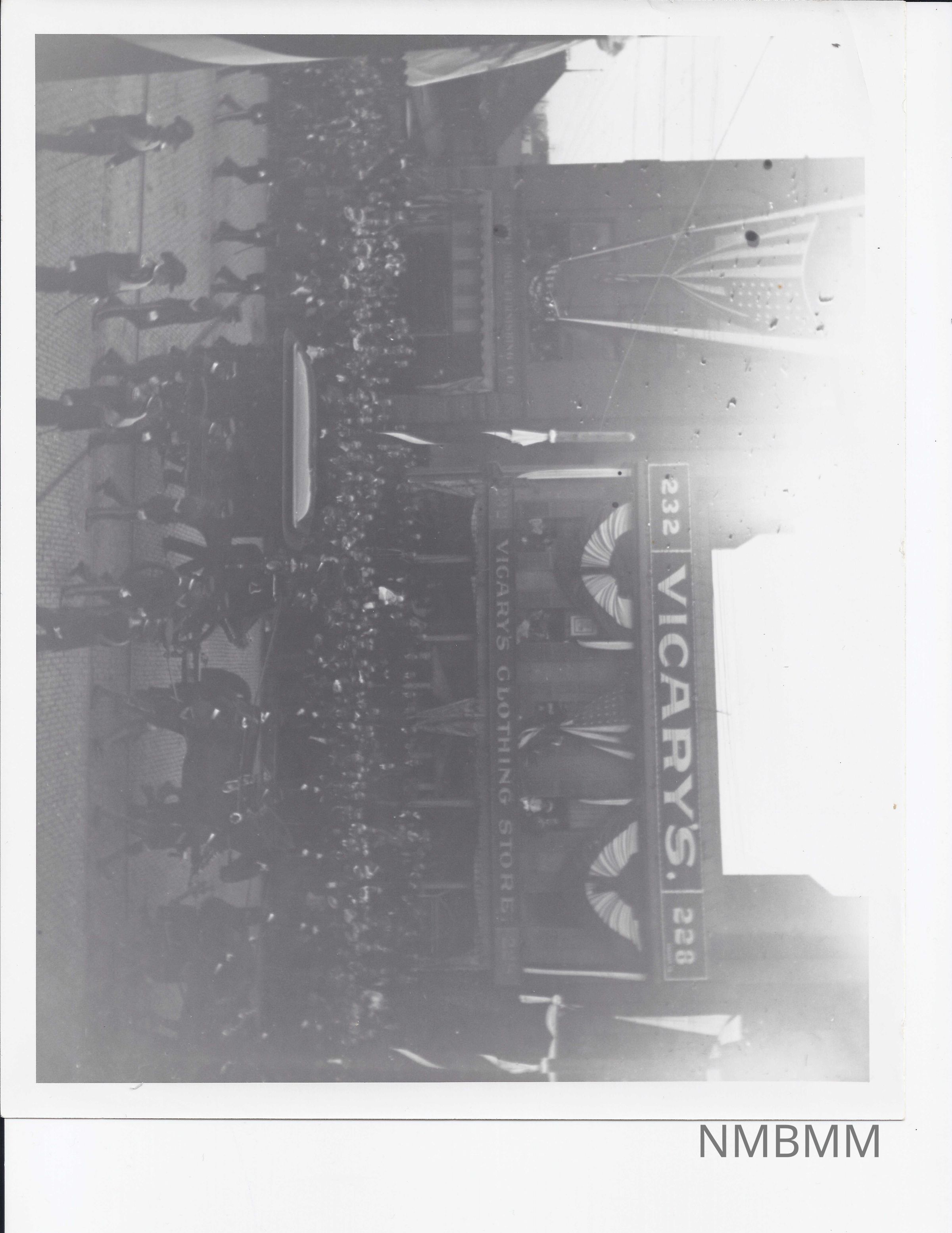This is a black and white picture that shows the funeral procession of President McKinley in Canton, Ohio. The casket is carried in a carriage surrounded by soldiers as the crowd watches them from the front of Vicary's Clothing Store. It measures 8" by 10".