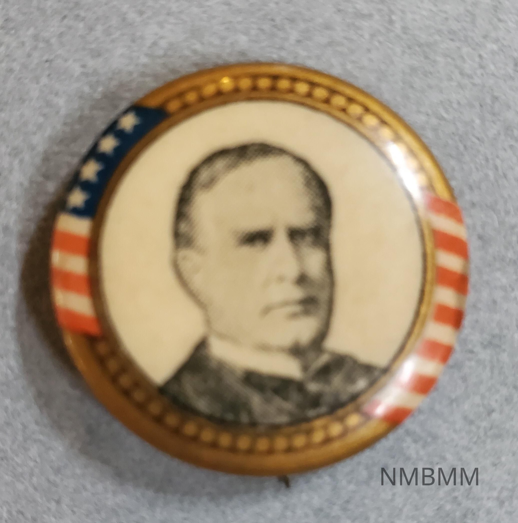 This item is a pin containing a portrait of President McKinley. Behind the portrait is an American flag and a gold background. The back reads, "The Whitehead and Hoag Co., Newark, NJ."Acquisition
