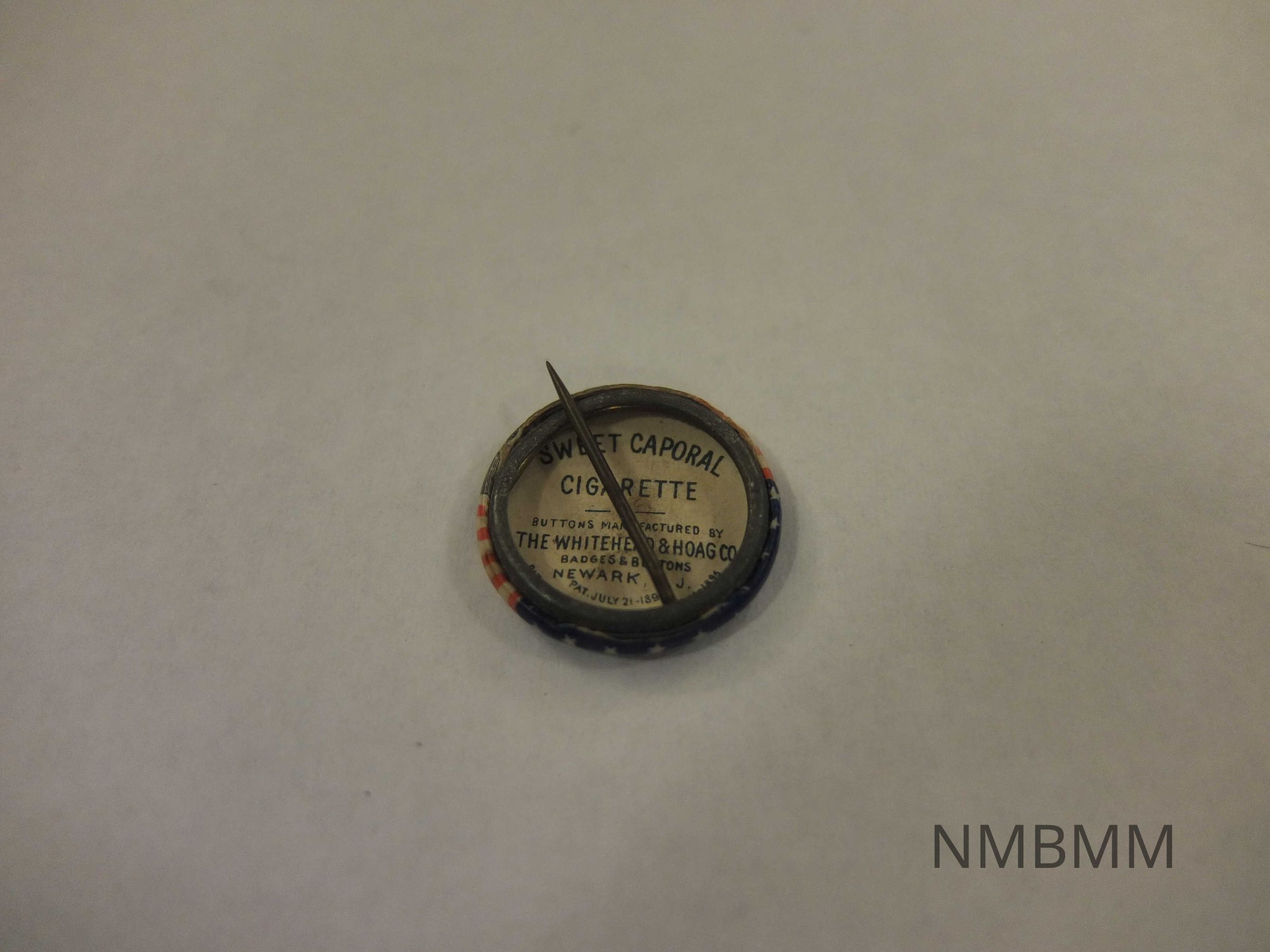 This item is a pin containing a portrait of President McKinley. Above the portrait, are nine stars and below it are horizontal red and white stripes. The caption reads, "McKinley." The back of the pin reads, "Sweet Caporal Cigarette, buttons manufactured by the Whitehead and Hoag Co., Gadgets and Buttons. Newark, NJ."Collection