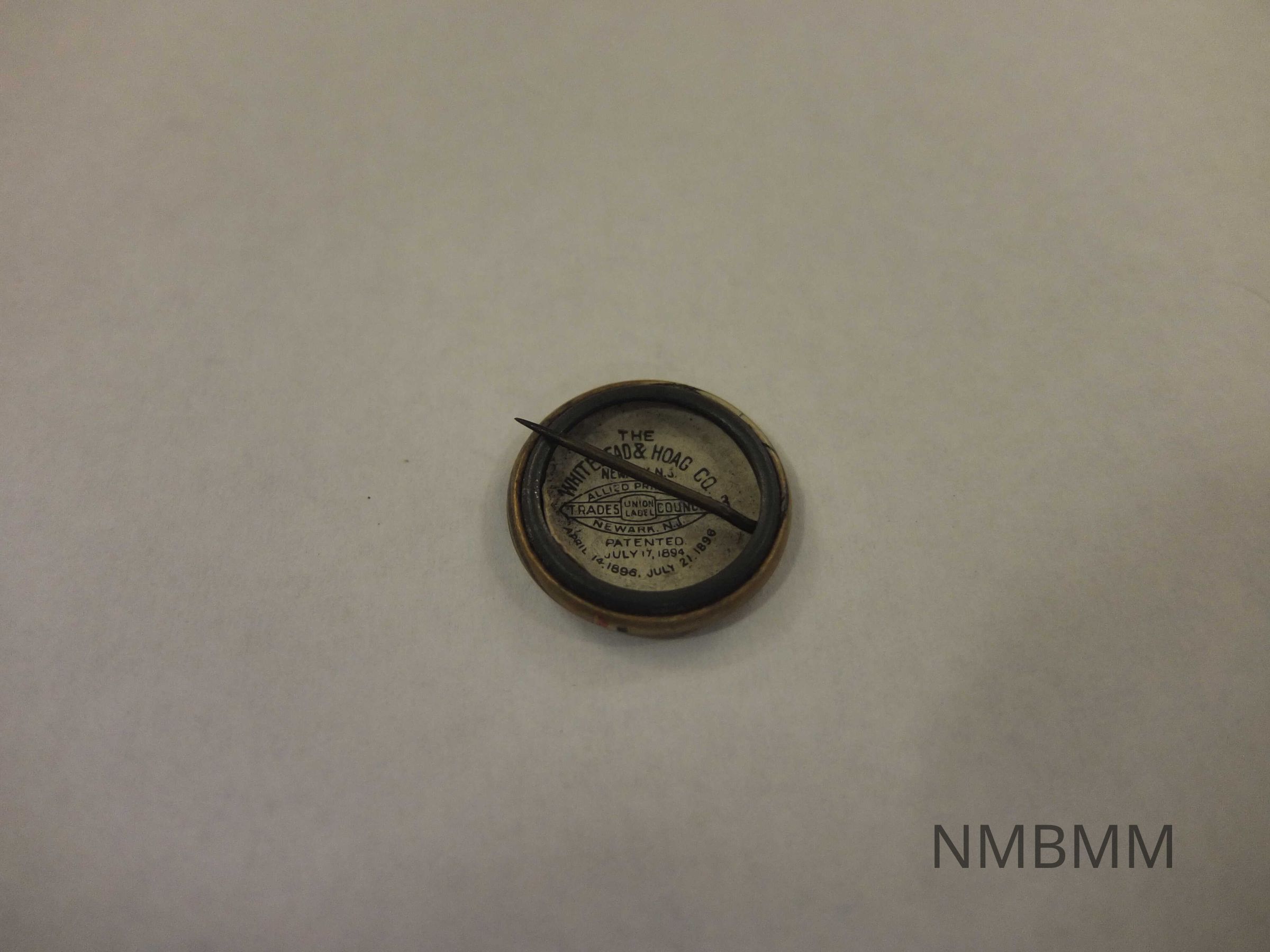 This item is a gold pin containing a portrait of President McKinley aligned on the bottom left side. Above the portrait, is an American flag ribbon. The back reads, "The Whitehead and Hoag Co., Newark, NJ., Patented July 17, 1894."Collection