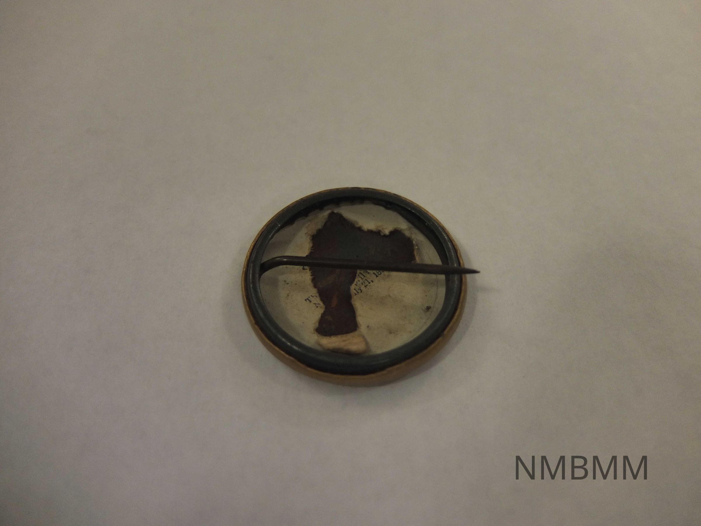 This item is a gold pin containing portraits of President McKinley and Vice-Presidential candidate Theodore Roosevelt. Above the portraits are seven stars with a blue background, and vertical stars and stripes below the portraits.Collection