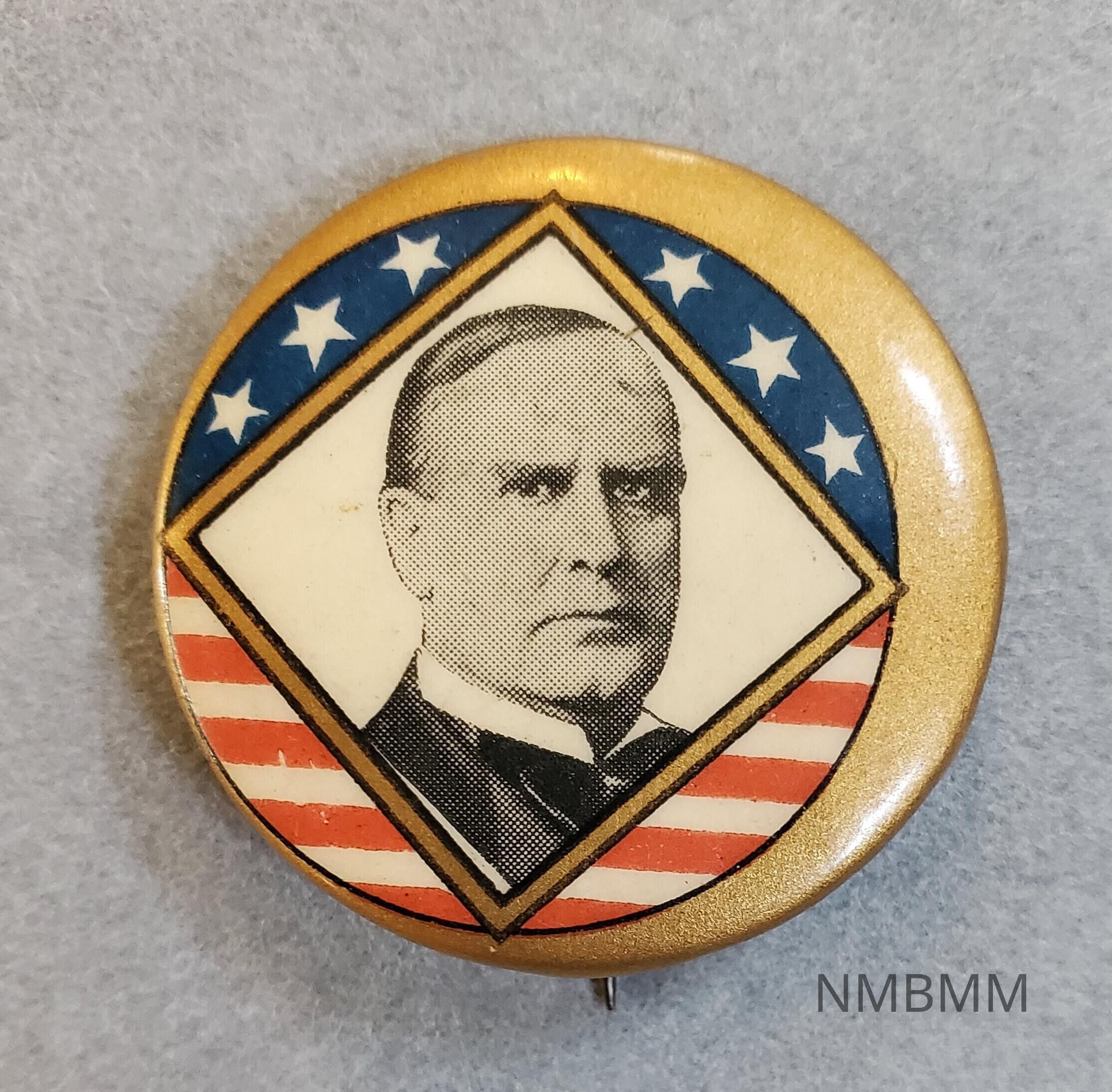 This item is a gold campaign pin containing a portrait of McKinley. The portrait is diamond shaped; and there is a circular American flag behind that.Acquisition