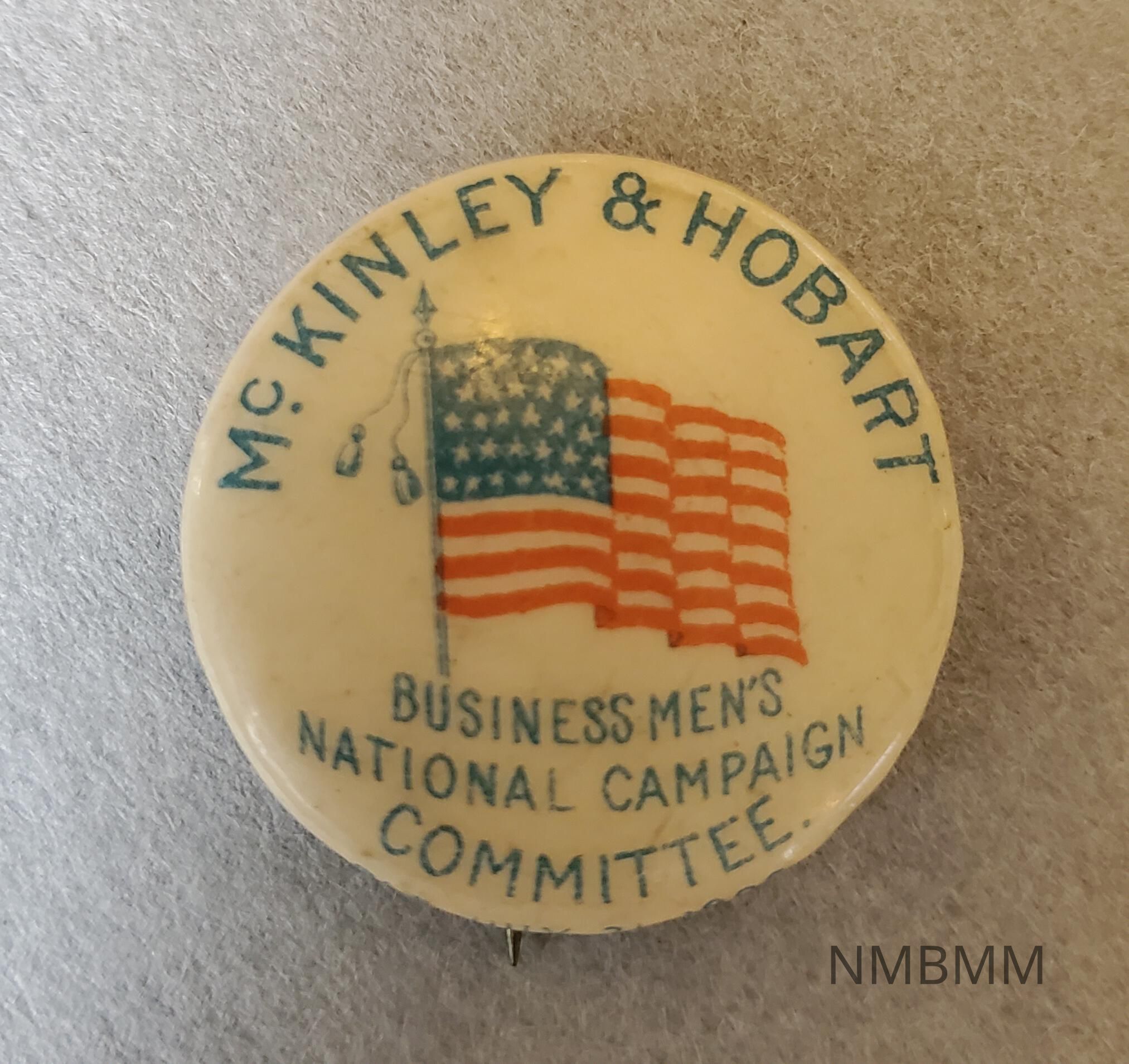 This item is a campaign pin for William McKinley and Garret Hobart. On the front, is an American flag with the captions, "McKinley and Hobart. Businessmen's National Campaign Committee." The back reads, " The Whitehead and Hoag Co., Newark NJ, Patented July17, 1894- April 14, 1896, July 21, 1896."