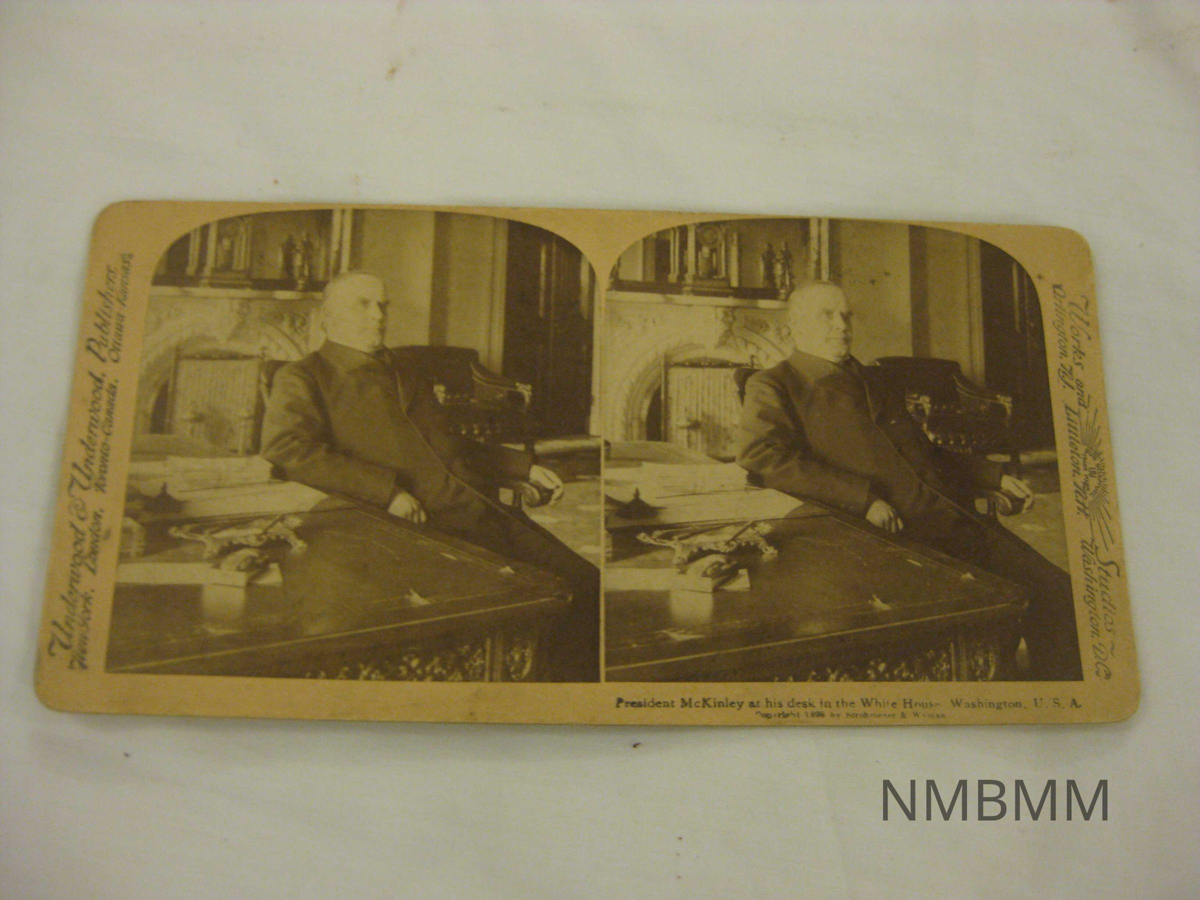 The item is a stereograph card of President McKinley at his desk in the White House. Copyright 1898 by Strohmeyer and Wyman. The back features the phrase, "President McKinley at his desk in the White House, Washington, D.C." in several languages.Collection