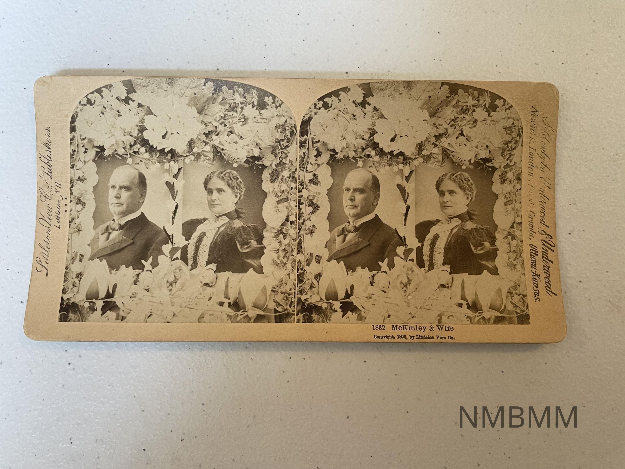 The item is a stereograph card containing double portraits of President McKinley and Ida McKinley surrounded by flowers. Copyright 1896 by Littleton View Company. New York, London, Canada, Ottawa- Kansas.Collection