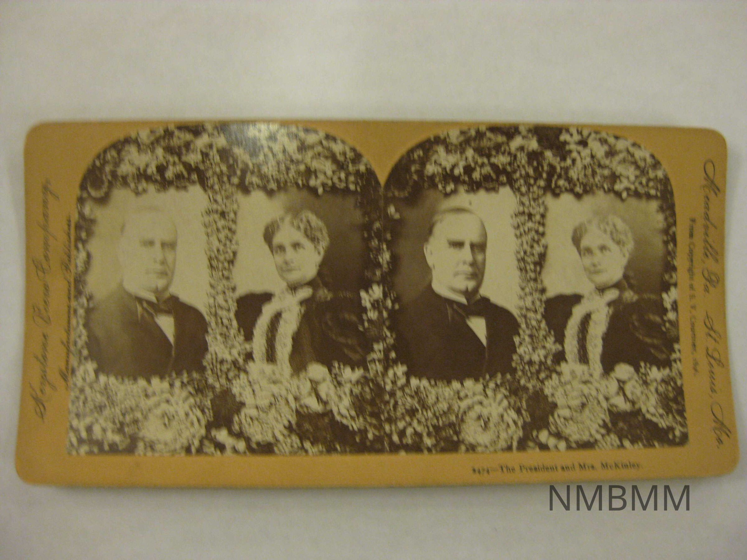 The item is a stereograph card containing two sets of portraits of President McKinley and Ida McKinley surrounded by flowers. Copyright 1896, by S.W. Courtney.