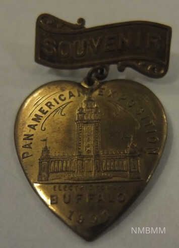 This item is a gold heart shaped pin with a relief of the electric tower in Buffalo, NY. The captions read, "Souvenir. Pan-American Exposition, Buffalo, 1901." The back says, "Schwaabs & Co., U.S.A."Collection