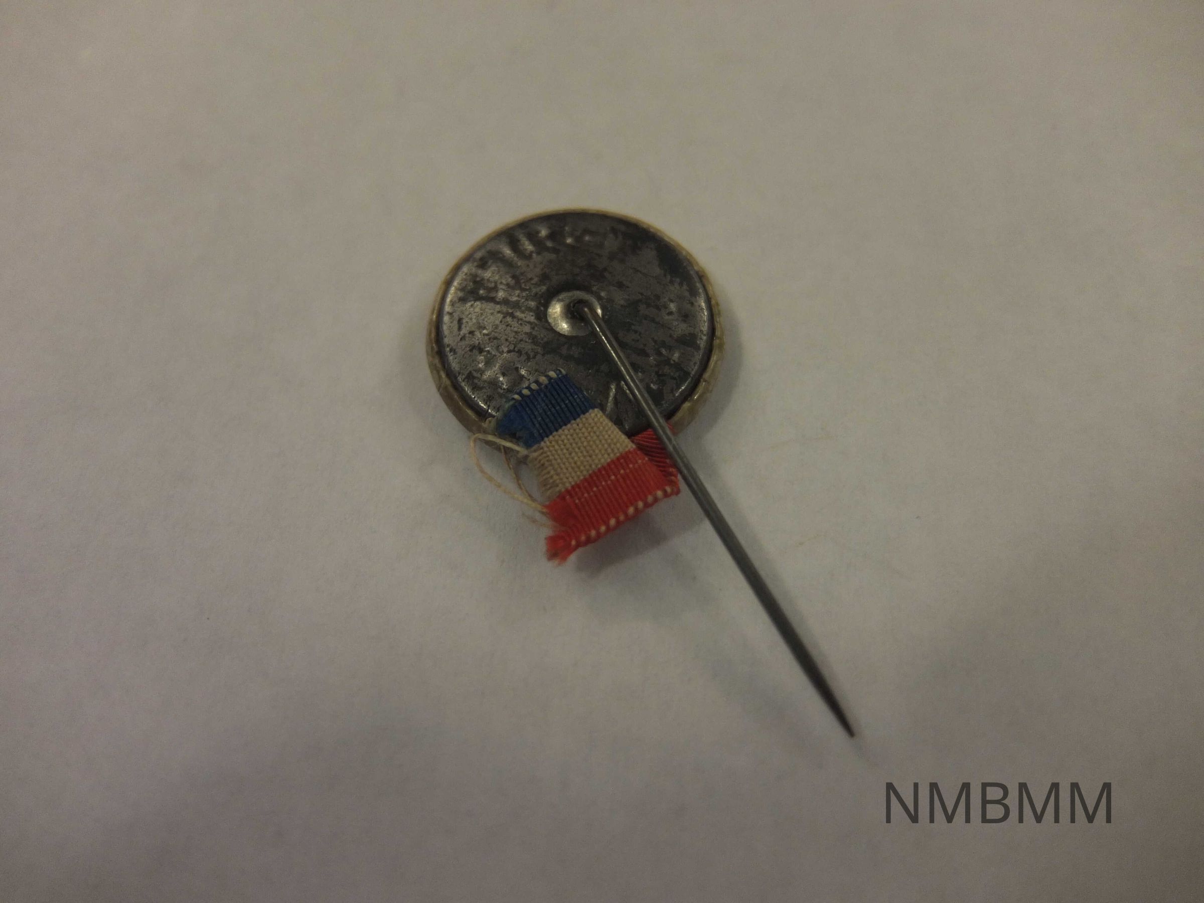 This item is a small picture pin that features a picture of President McKinley's home in Canton, a red, white, and blue ribbon, and a straight back pin. It includes the words, "McKinley Homestead Republican Shrine." It was made by the Shaw Co. Philadelphia. 7/8 inches x 1 3/4 inches.Collection