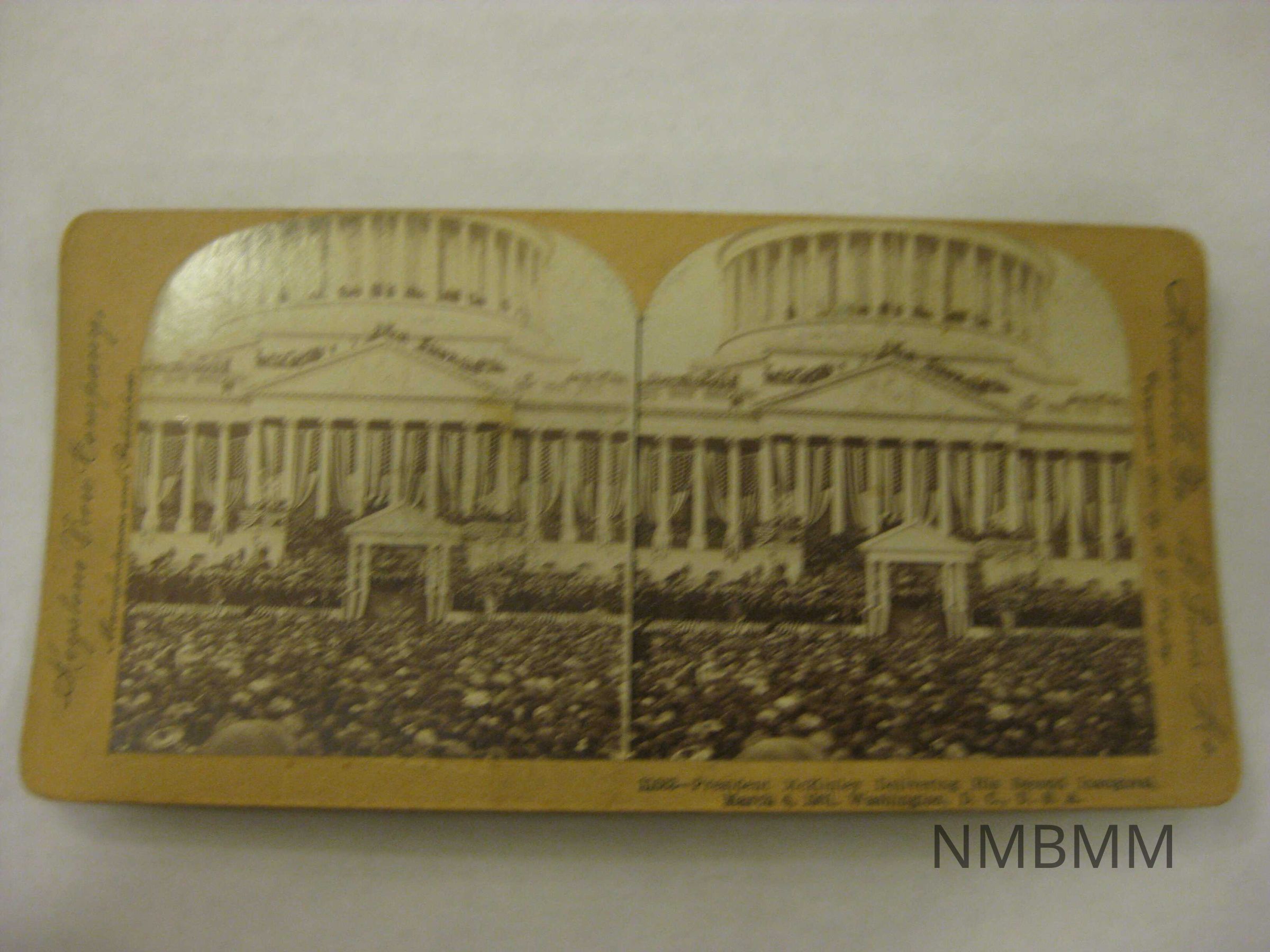The item is a stereograph card containing two pictures of President McKinley delivering a speech during his second inauguration. Copyright, 1901, by B.L. Singley.Collection