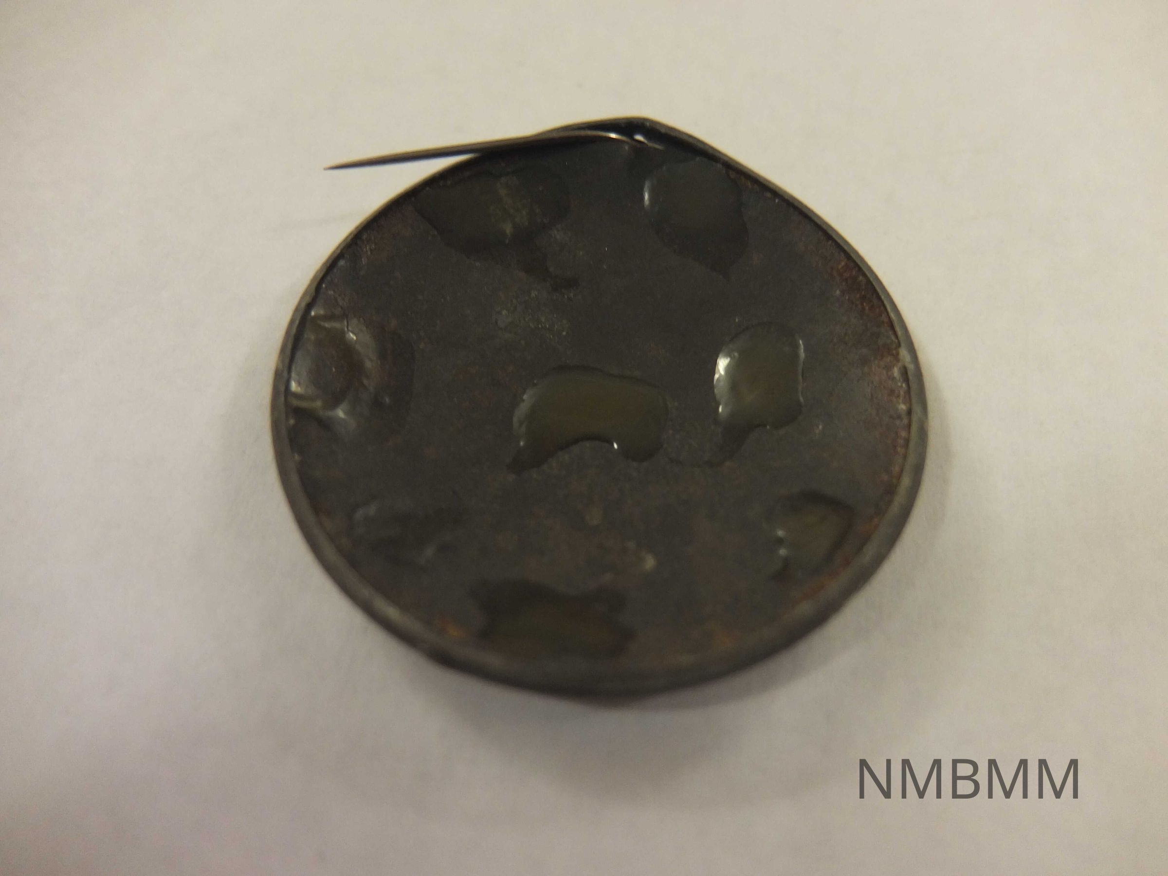 This item is a pin featuring a black and white map including states: Wisconsin, Illinois, Michigan, Indiana, Kentucky, Ohio, West Virginia, Pennsylvania, Maryland, and New York. Indiana, Kentucky, and West Virginia are labeled states that must be carried. Ohio has many labels including Columbus as "the logical headquarters." Title is "The Political Storm Center For 1900." Pin is detached and is most likely not original.Collection