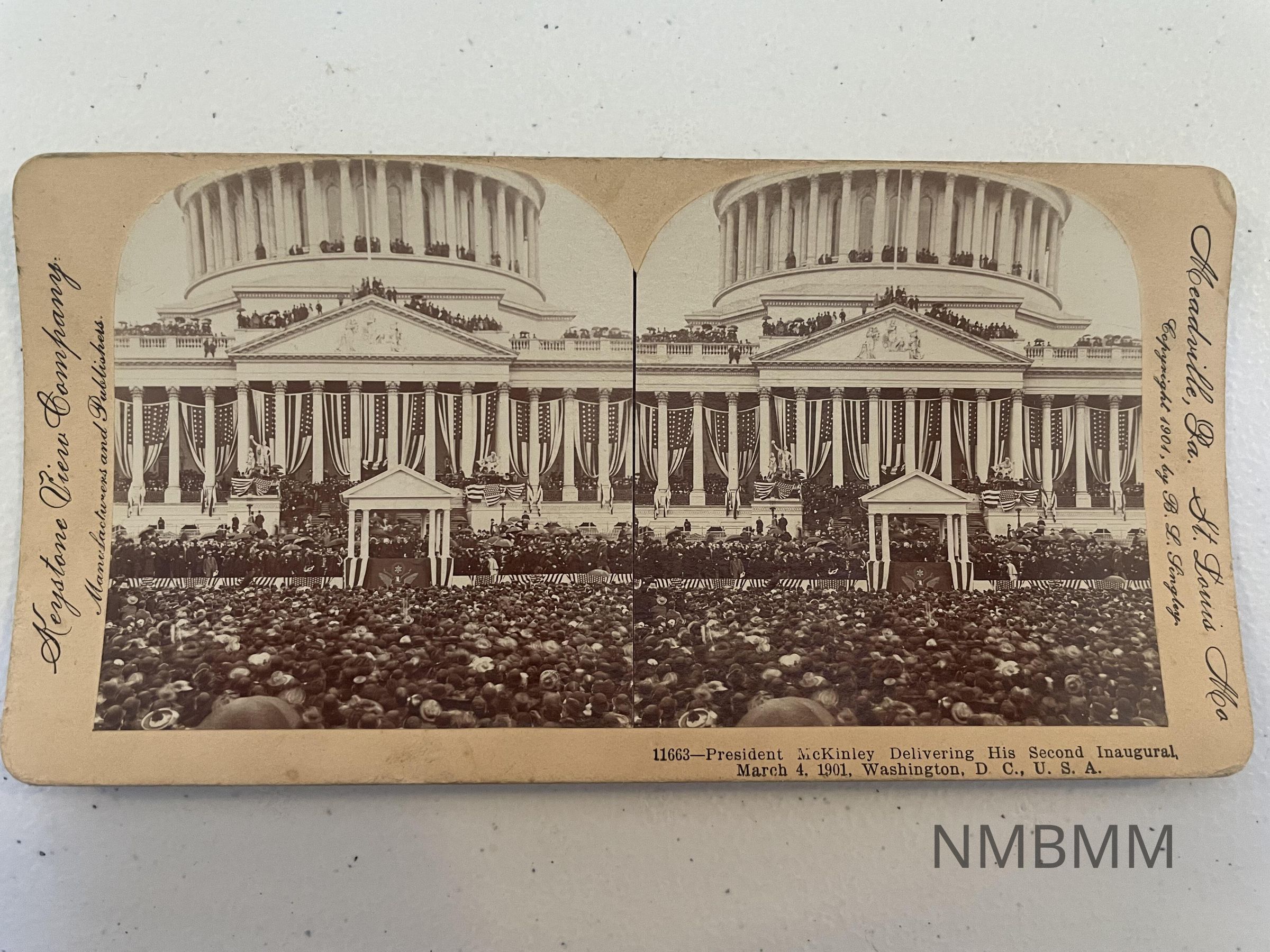 The item is a stereograph card containing two pictures of President McKinley delivering a speech during his second inauguration.