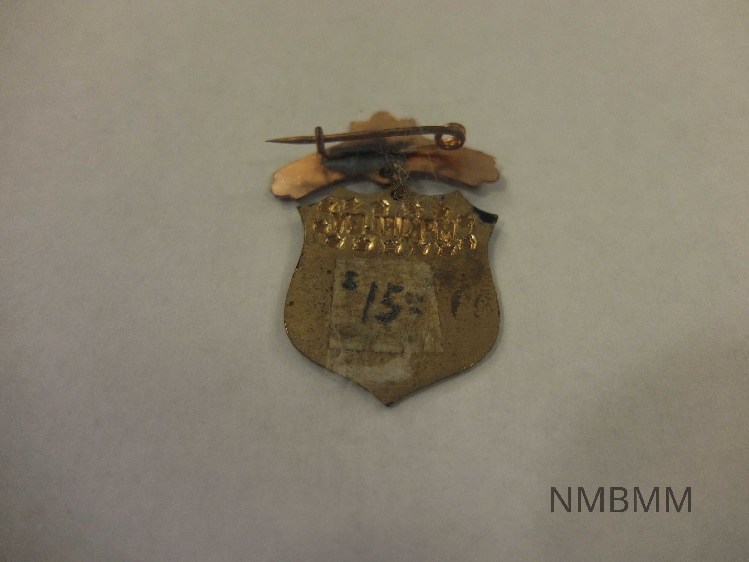 This item is a campaign pin in the shape of a shield. The shield dangles down from a patterned banner. At the top of the shield is McKinley's name in gold surrounded by gold stars and a dark blue background. The bottom of the shield is red and white stripes outlined in gold. In small plastic bag.
