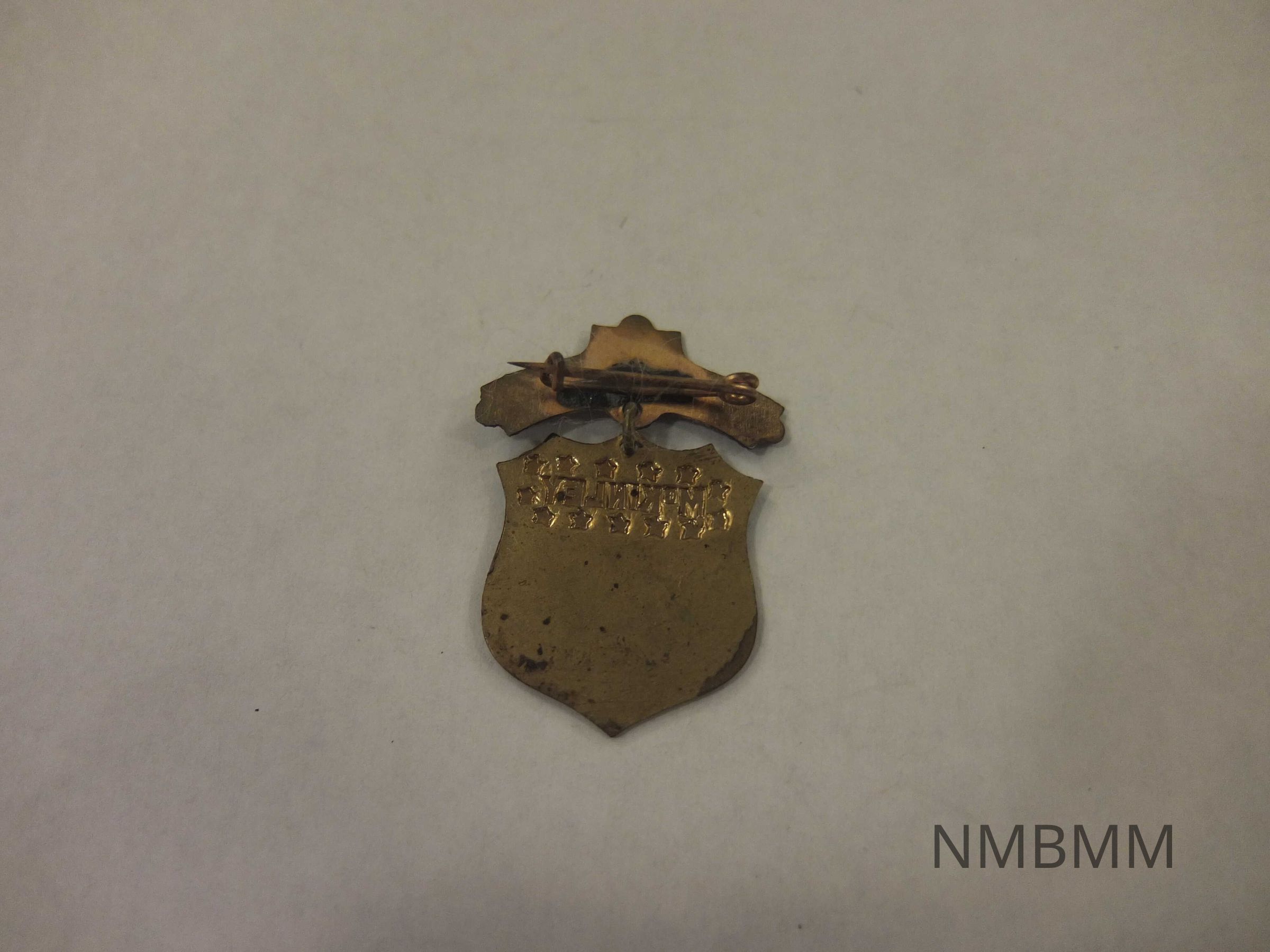 This item is a campaign pin in the shape of a shield. The shield dangles down from a patterned banner. At the top of the shield is McKinley's name in gold surrounded by gold stars and a dark blue background. The bottom of the shield is red and white stripes outlined in gold. In small plastic bag.