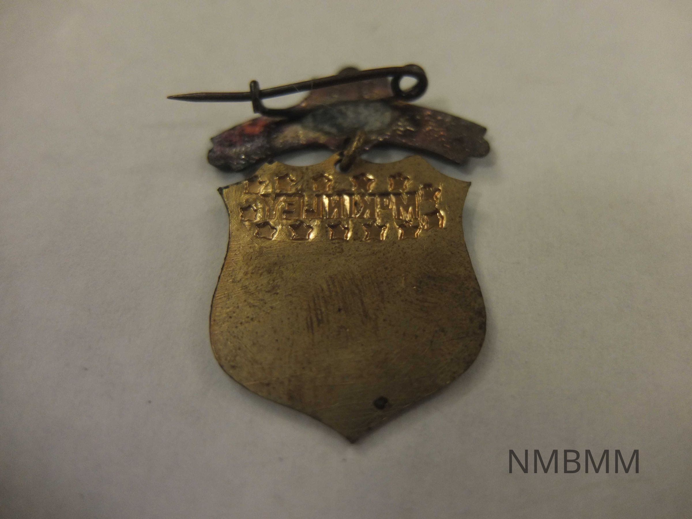 This item is a campaign pin in the shape of a shield. The shield dangles down from a patterned banner. At the top of the shield is McKinley's name in gold surrounded by gold stars and a dark blue background. The bottom of the shield is red and white stripes outlined in gold. In small plastic bag.Collection