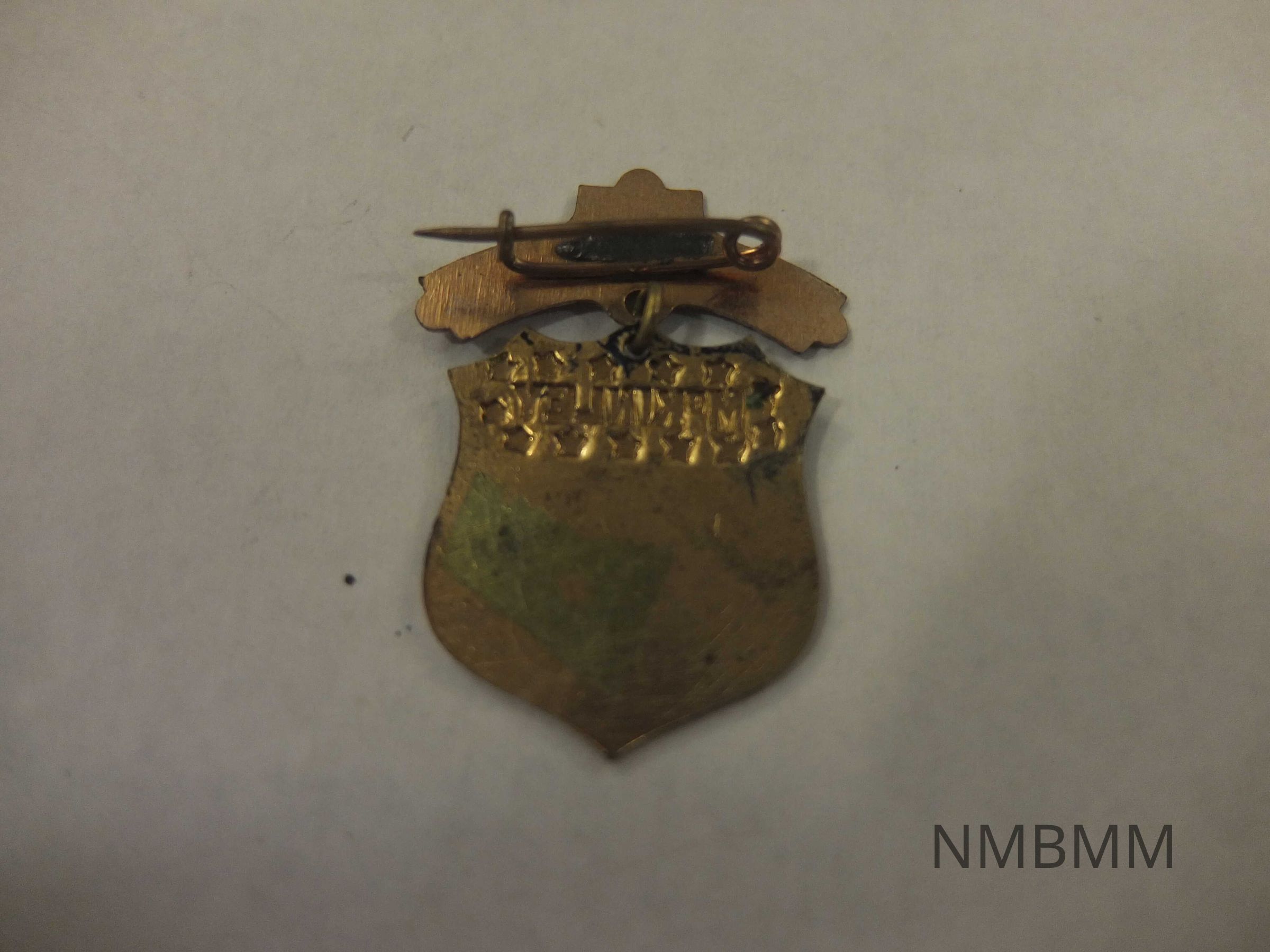 This item is a campaign pin in the shape of a shield. The shield dangles down from a patterned banner. At the top of the shield is McKinley's name in gold surrounded by gold stars and a dark blue background. The bottom of the shield is red and white stripes outlined in gold. In small plastic bag.Collection