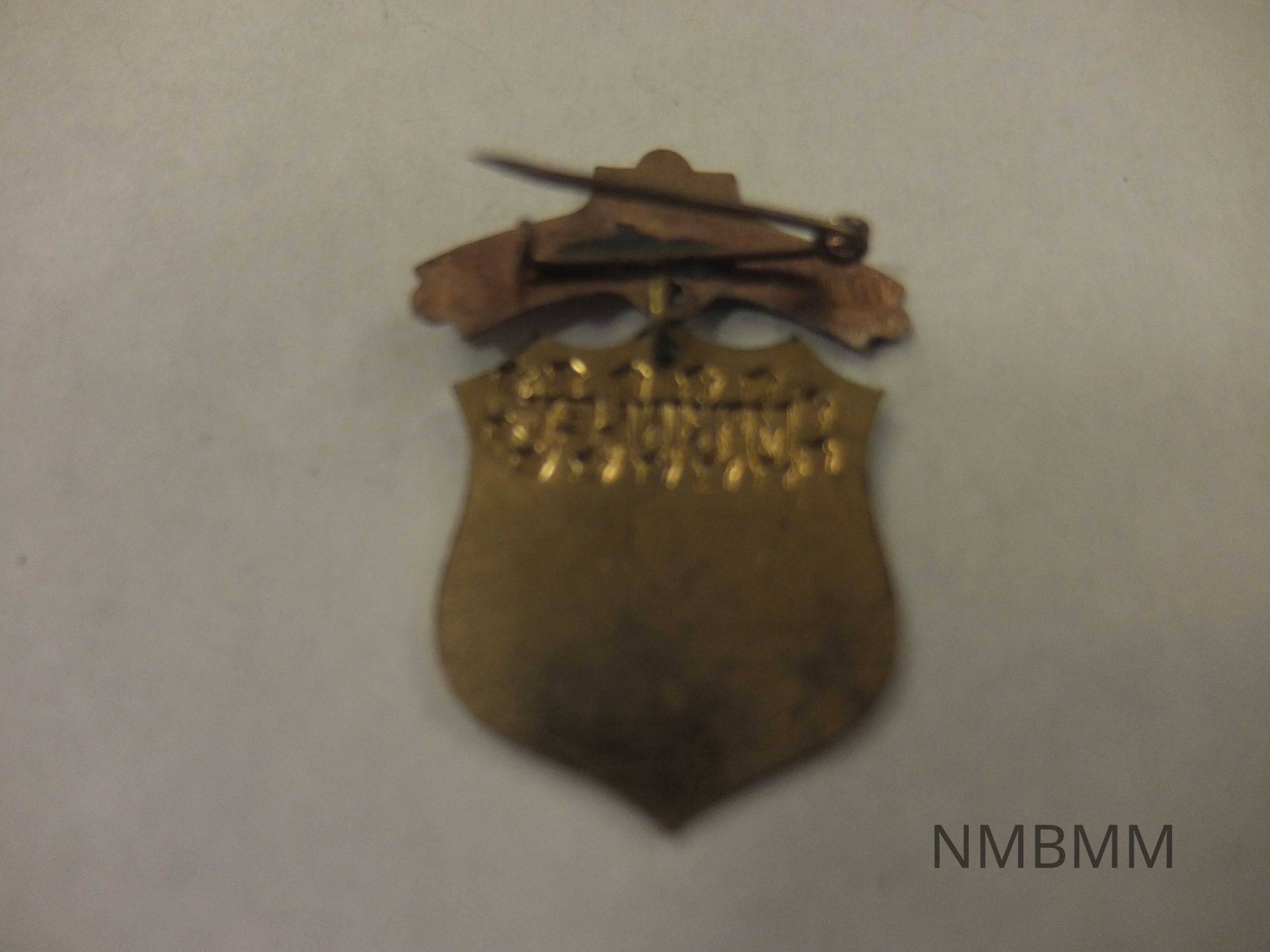 This item is a campaign pin in the shape of a shield. The shield dangles down from a patterned banner. At the top of the shield is McKinley's name in gold surrounded by gold stars and a dark blue background. The bottom of the shield is red and white stripes outlined in gold.Collection