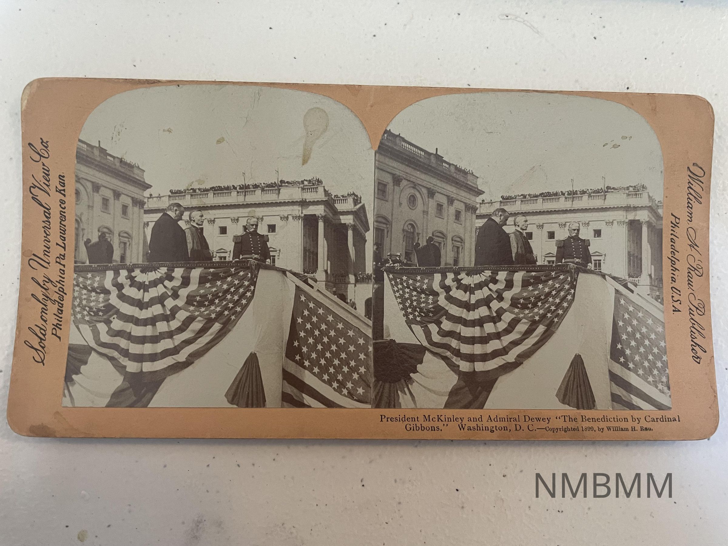 This item is a stereograph containing two images of the benediction of President McKinley and Admiral Dewey by Cardinal Gibbons. The image has the three men on a stage adorned with American flags.