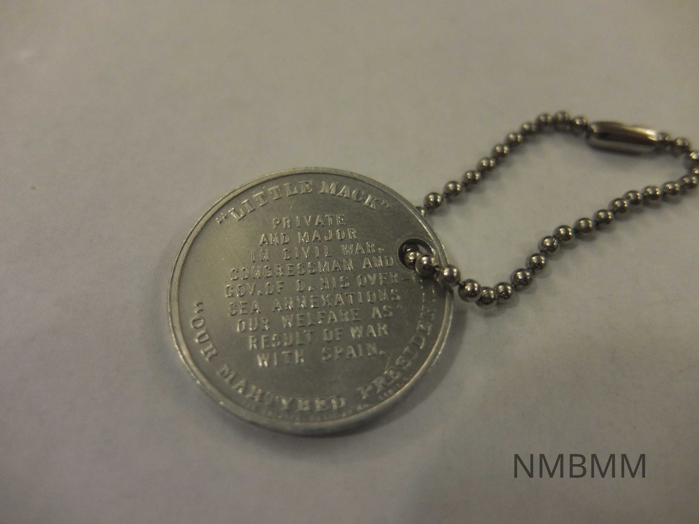 This item is a commemorative silver coin attached to a small ball chain. One side features an engraved portrait of McKinley with the text above his head, "25th President U.S.A. 1897 1901." Below his head his name is engraved. The other side says "'Little Mack' Private and Major in Civil War. Congressman and Gov. of O. His Over- Sea Annexations our Welfare as Result of War with Spain." There is a small makers mark below the text that is difficult to read.Collection