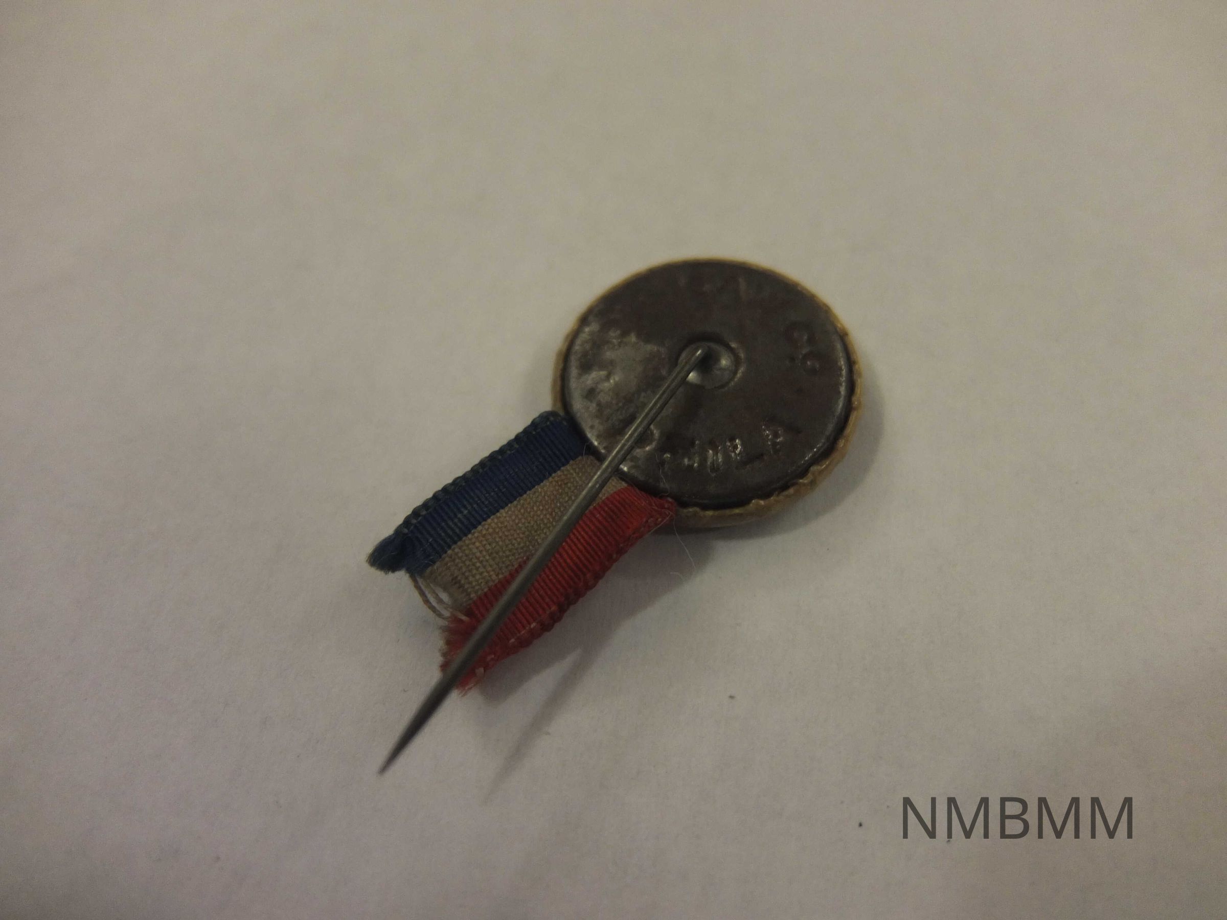 This item is a small picture pin that features a picture of President McKinley's home in Canton, a red, white, and blue ribbon, and a straight back pin. It includes the words, "McKinley Homestead Republican Shrine." It was made by the Shaw Co. Philadelphia. 7/8 inches x 1 3/4 inches.