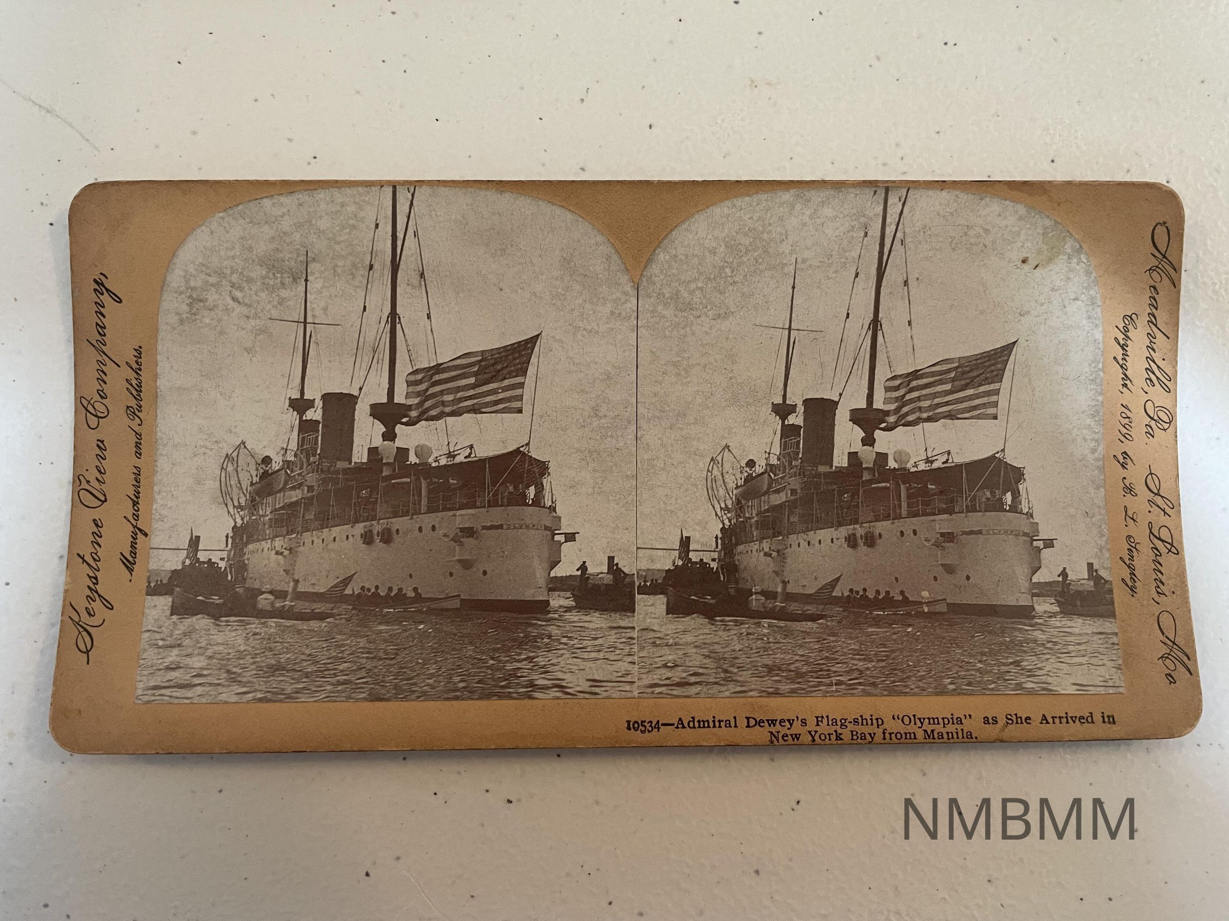 This item is a stereograph containing two images of the flagship "Olympia" in New York Bay arriving from Manila.