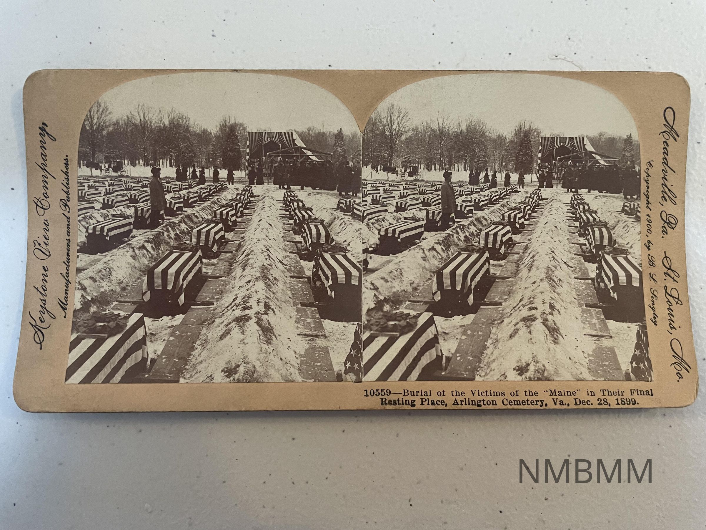 This item is a stereograph containing two images of the burial of victims of the USS Maine explosion at Arlington Cemetery in Virginia.