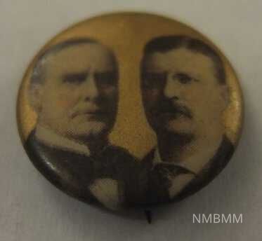 front of pin showing W. McKinley and T. Roosevelt on gold background