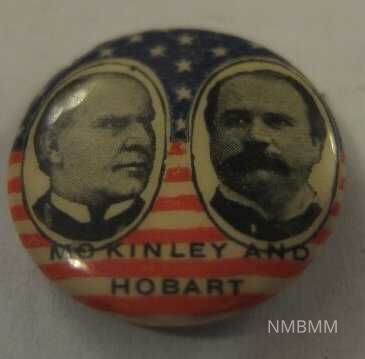front of pin: McKinley and Hobart on stars and stripes red/white/blue backg