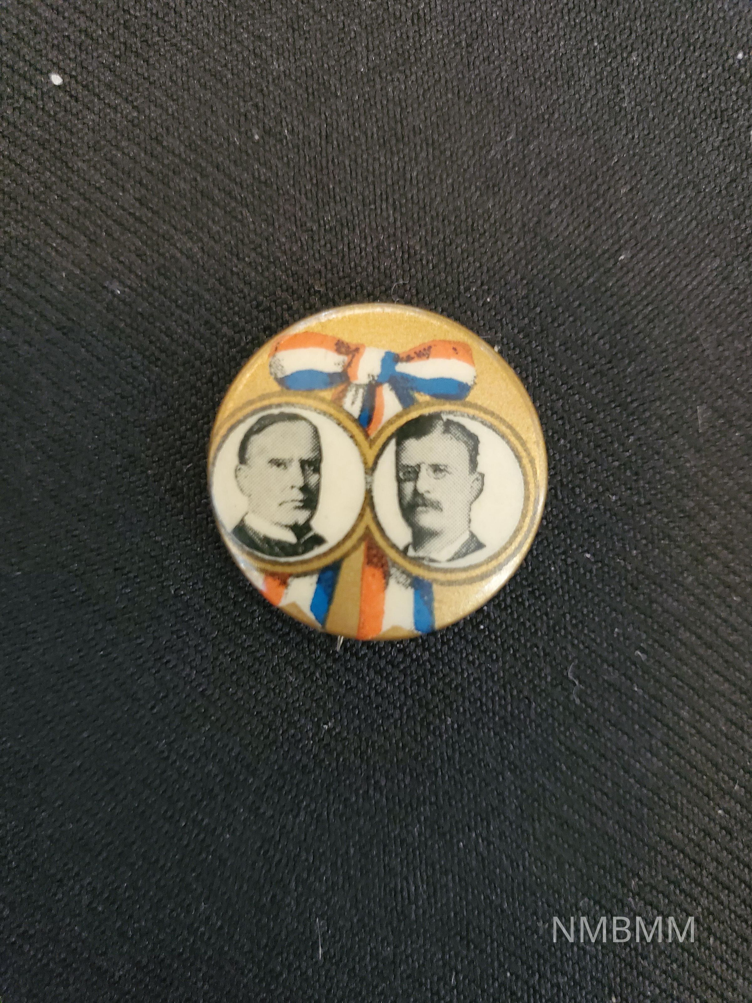 This item is a campaign pin. The pin features photos of President William McKinley and his 1900 running mate Theodore Roosevelt on a background of a red and white bow with gold background. The back features an inscription "The Whitehead Hoag Co. Patented July 17, 1894."Acquisition