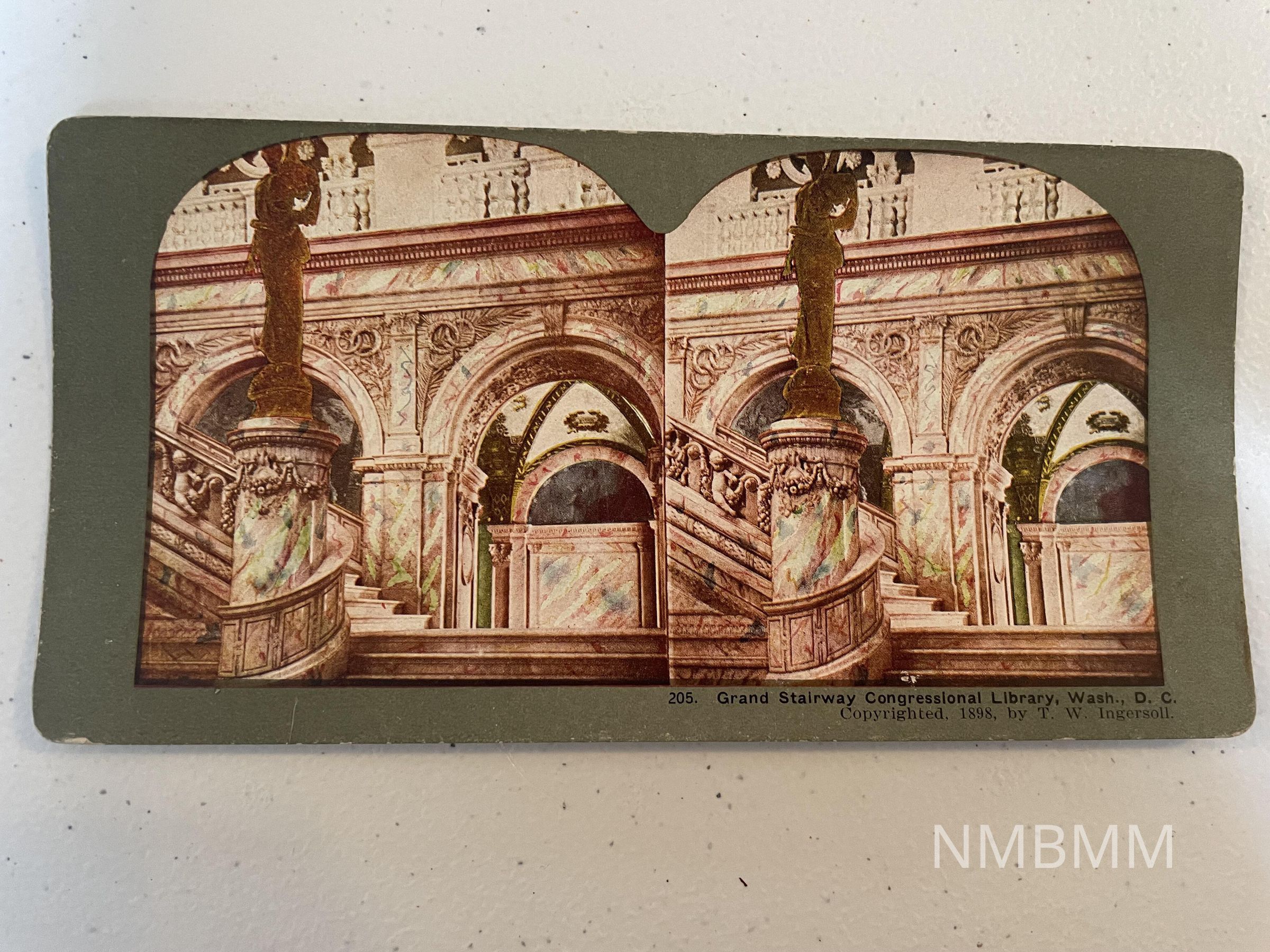 This item is a stereograph containing two images of the grand stairway in the Congressional Library in Washington,D.C- with a description of the Library of Congress on the back.