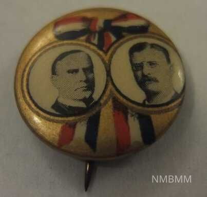 front of pin: offset image of McKinley and Roosevelt on gold with red/white