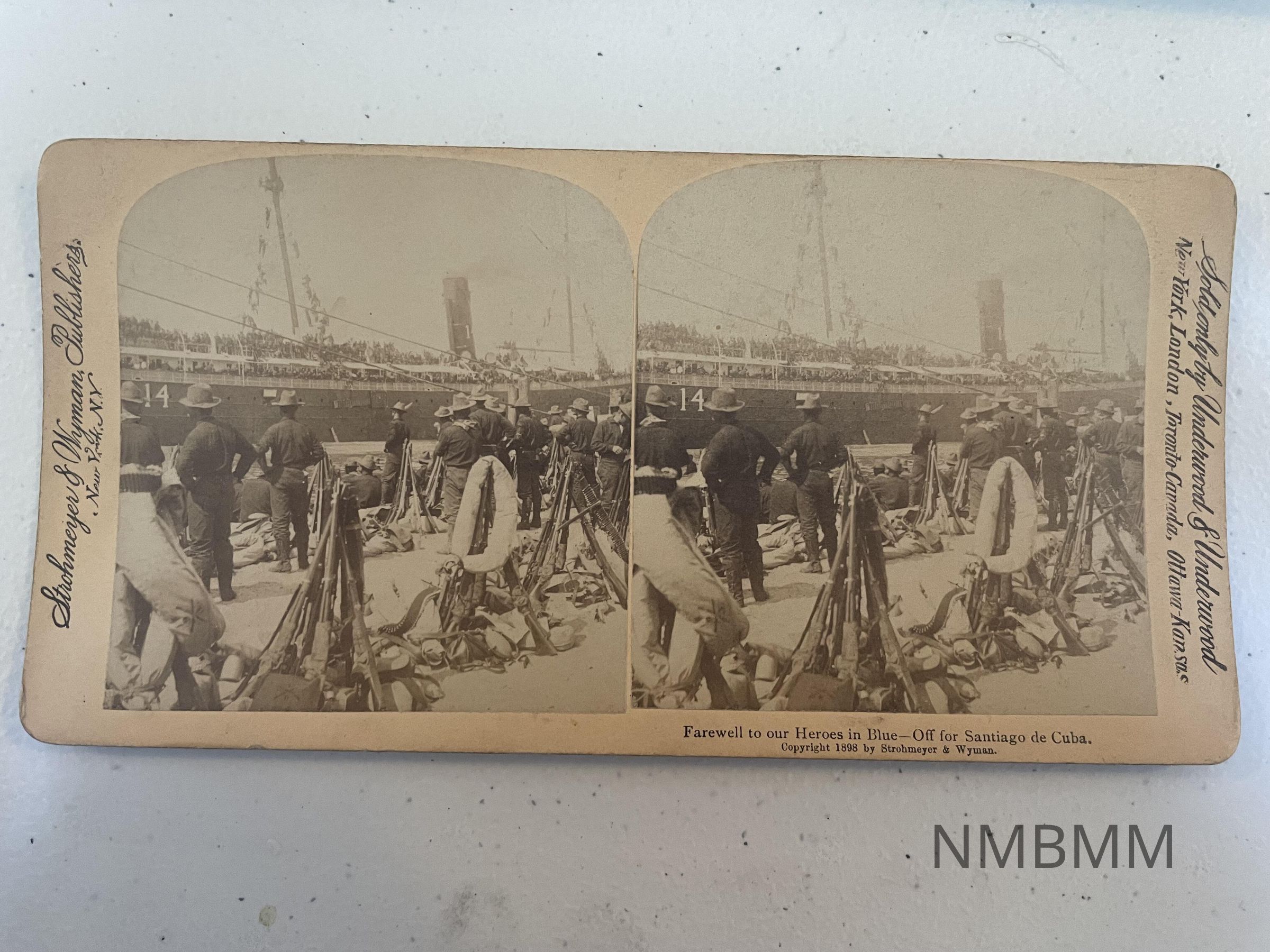 This item is a stereograph containing two images of US soldiers getting ready to be deployed to Santiago de Cuba.