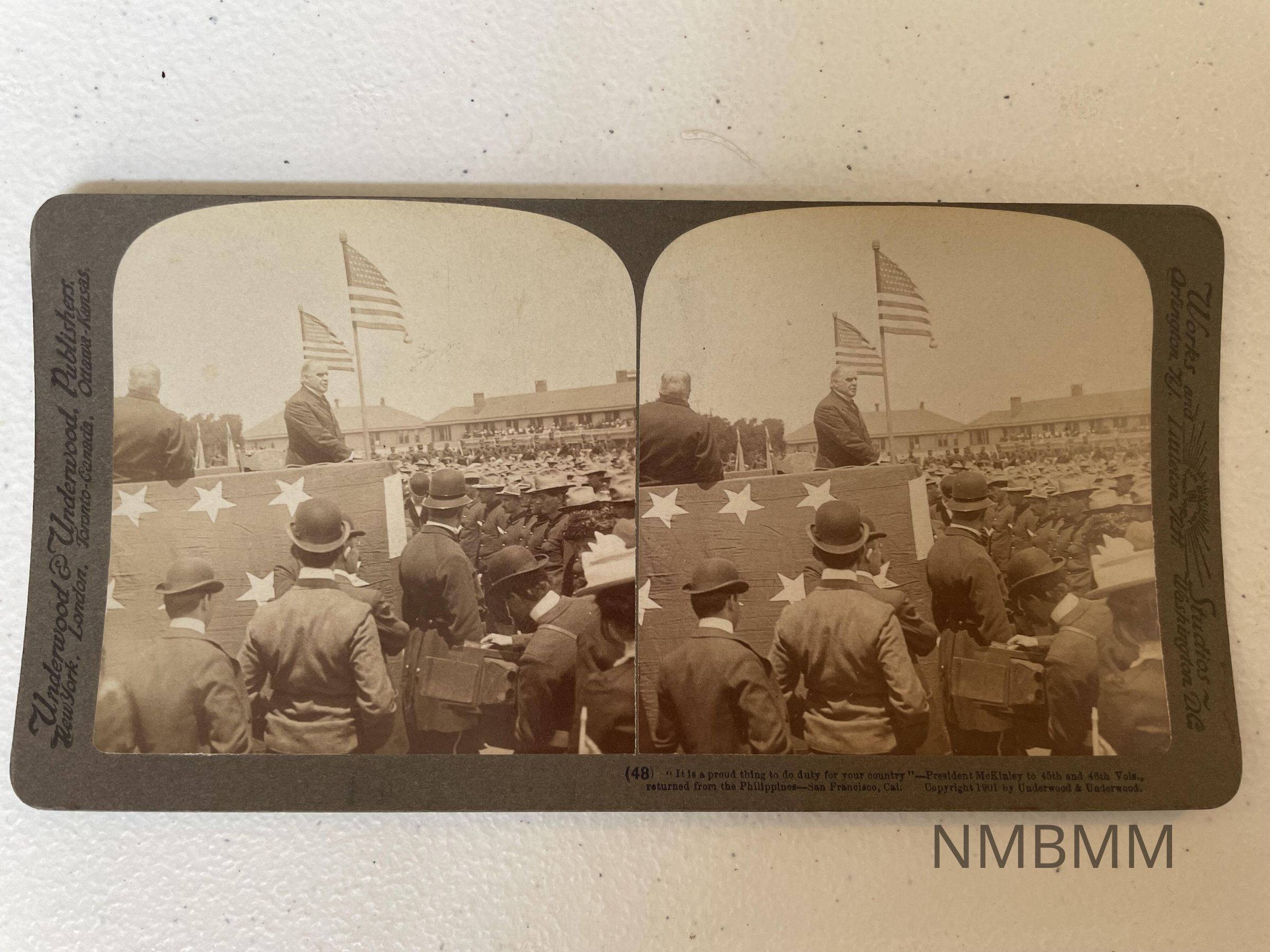 This item is a stereograph containing two images of President McKinley delivering a speech to soldiers returning from the Philipines in San Francisco. Copyright in 1901, by Underwood and Underwood.Collection